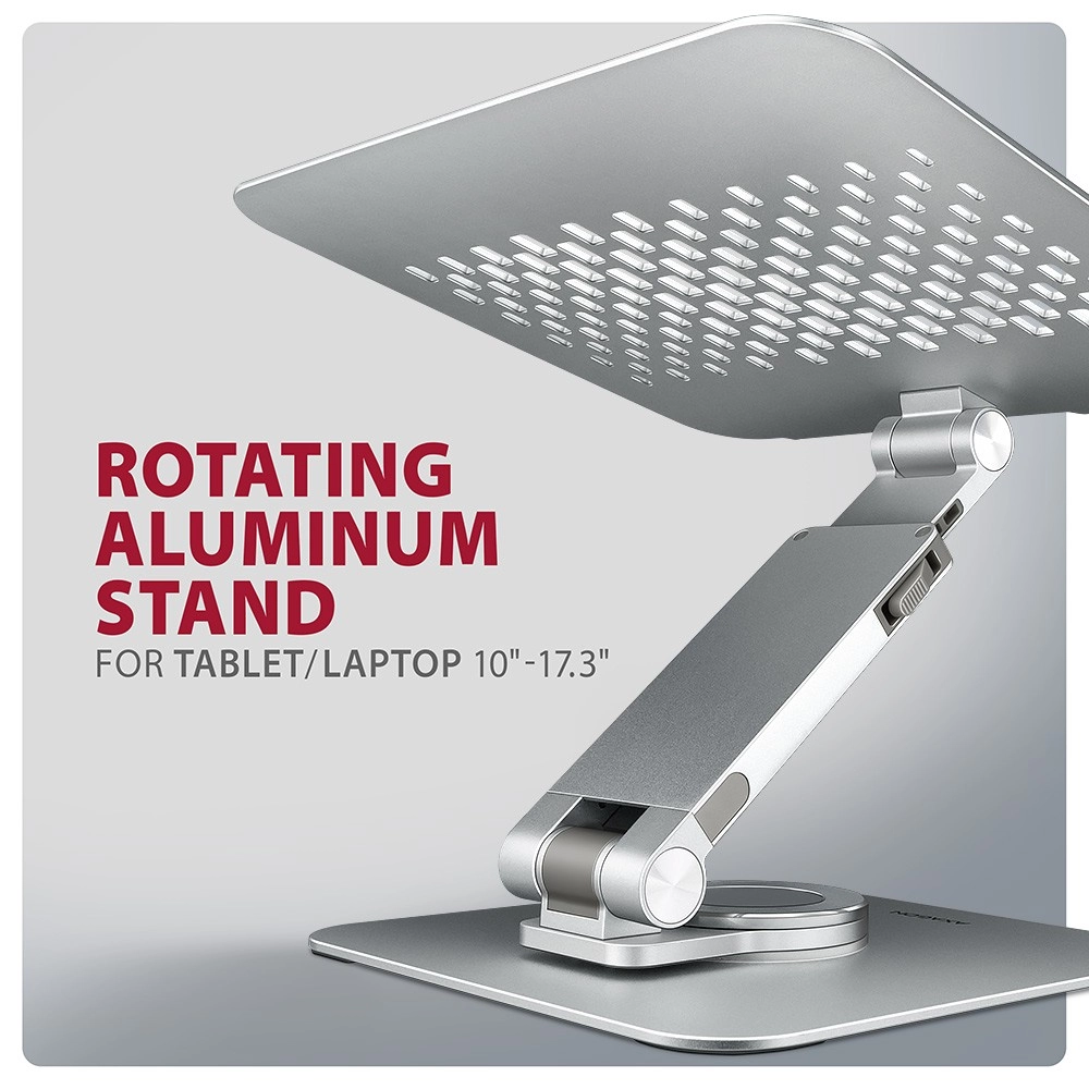 Ergonomische aluminium laptopstandaard AXAGON STND-LR met een 360° draaimechanisme, hoogteverstelling en verstelbare helling voor meer werkcomfort. Geschikt voor 10–17,3″ apparaten, met een uitschuifbare arm met vergrendeling, stabiele metalen constructie en antislipoppervlakken voor veilig gebruik en verbeterde warmteafvoer.