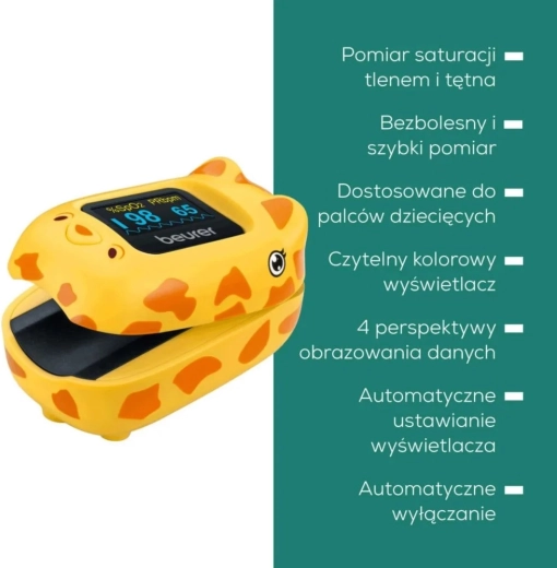 De Beurer PO 13 Kids pulsoximeter voor kinderen in een schattige giraffevorm biedt pijnloze meting van zuurstofsaturatie (SpO2) en hartslag binnen enkele seconden. Hij is aangepast aan kleine kinder vingers, heeft een kleurendisplay met automatische oriëntatie en levert betrouwbare resultaten voor gezondheidscontrole thuis.