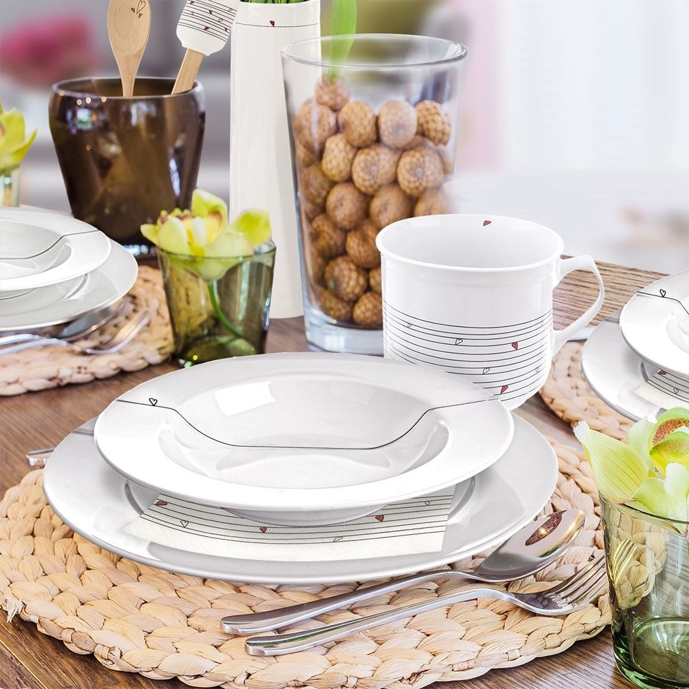 Helder wit porselein met een dunne lijn en een klein hartje siert elke tafel en voegt een subtiele, moderne touch toe aan het serveren.