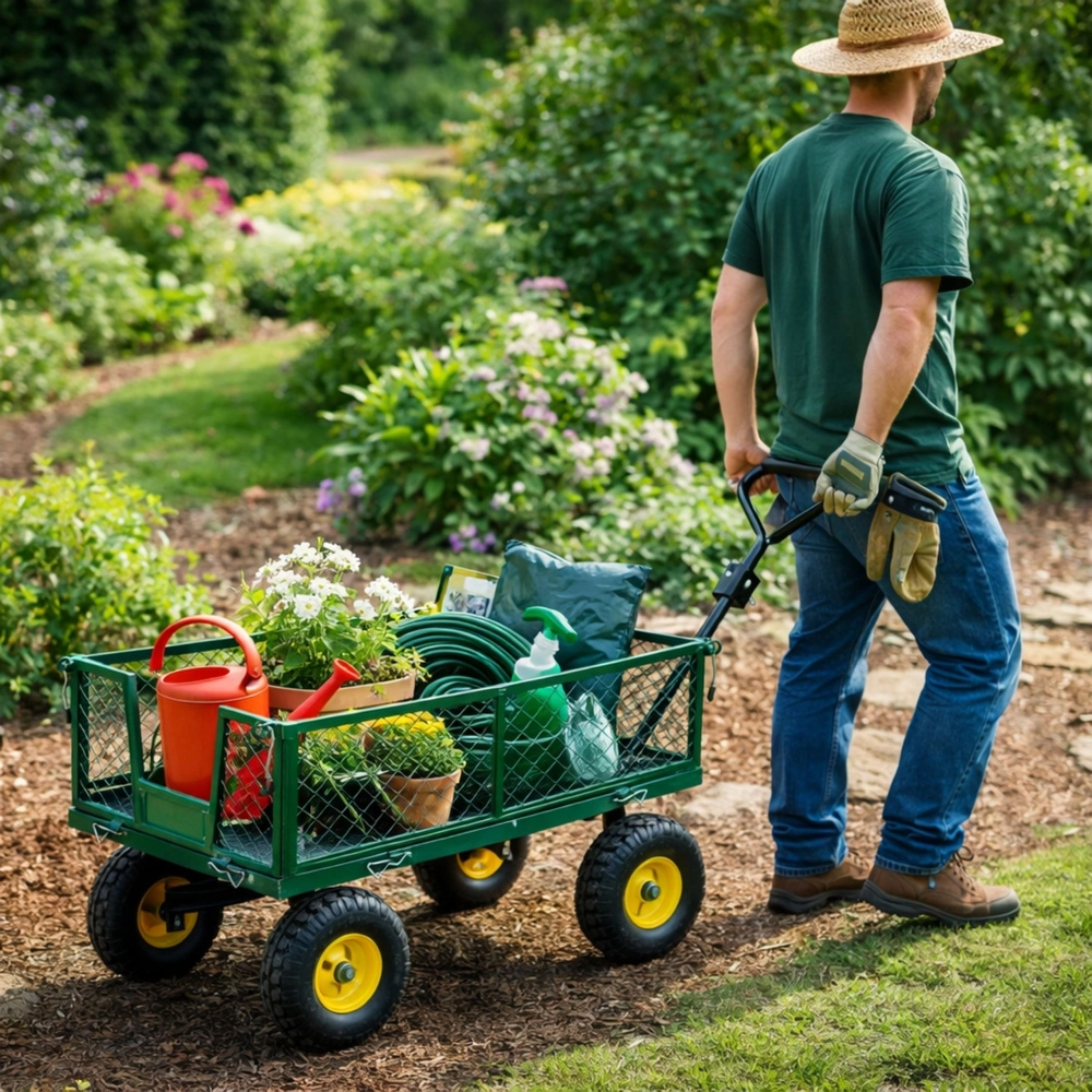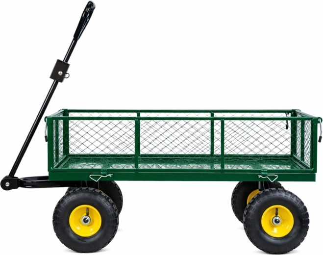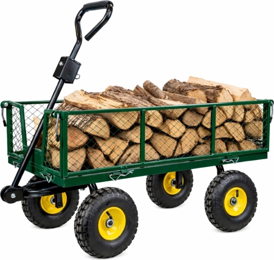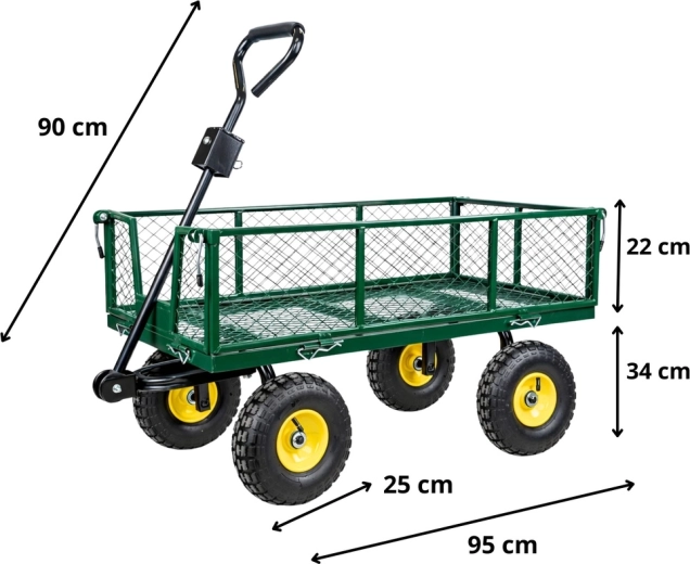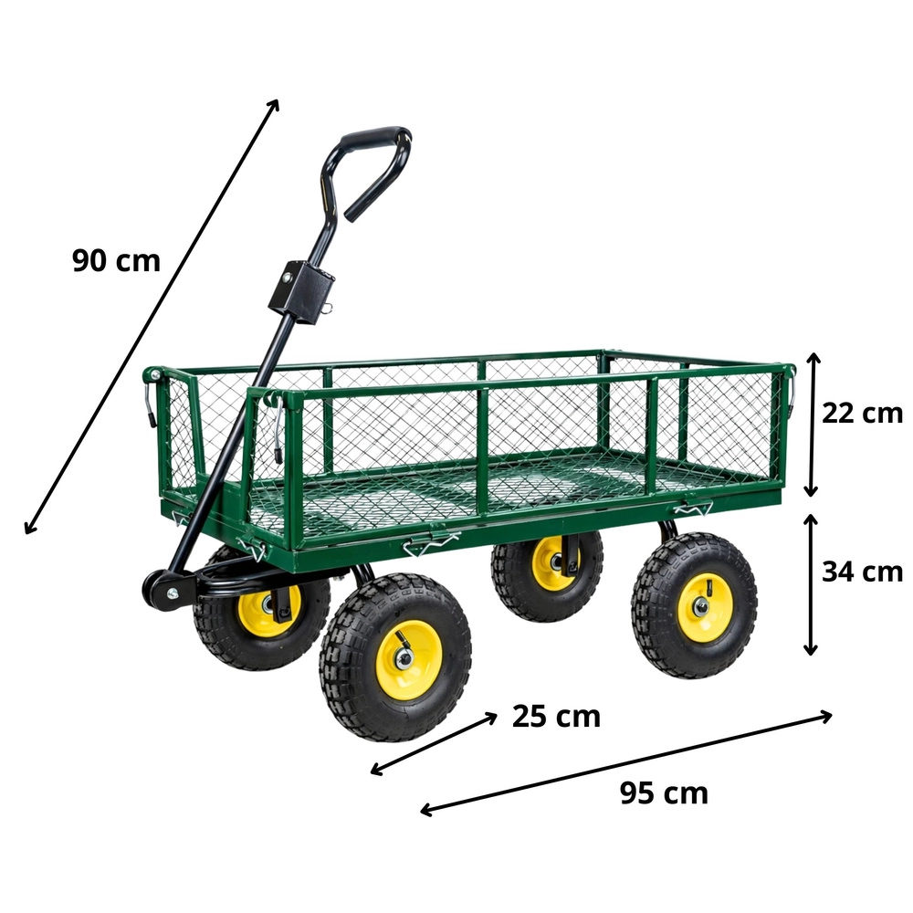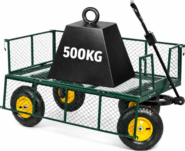 Zoekt u een veelzijdige hulp voor werk in de tuin, op de bouw of in de werkplaats? Deze stalen tuinkar met een draagvermogen van 200 kg kan aarde, hout, stenen en gereedschap aan. De stabiele vierwielige constructie met luchtbanden dempt oneffenheden op gras, grind en bestrating, terwijl de draaibare vooras zorgt voor nauwkeurig sturen, ook bij volle belading.