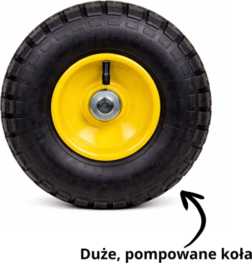 Vier grote pneumatische wielen met stalen velgen zorgen voor stabiliteit, grip en comfortabel rijden op gras, grind en bestrating.