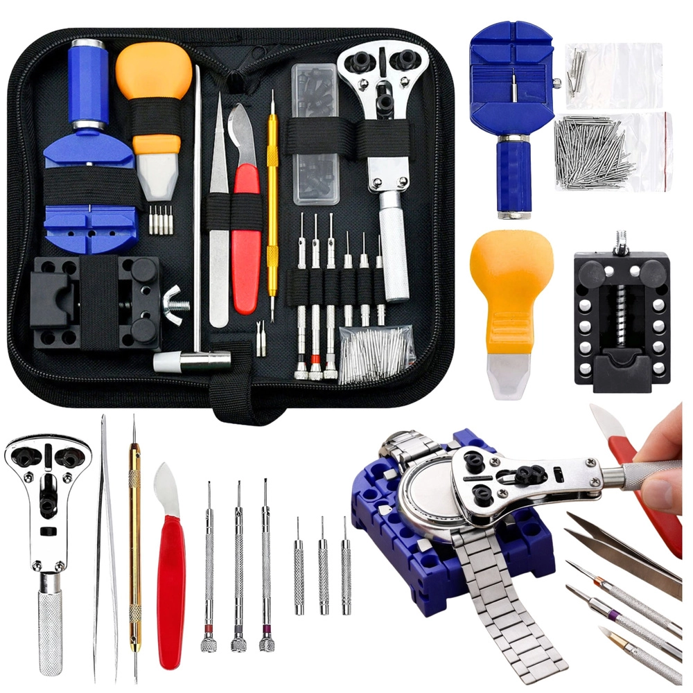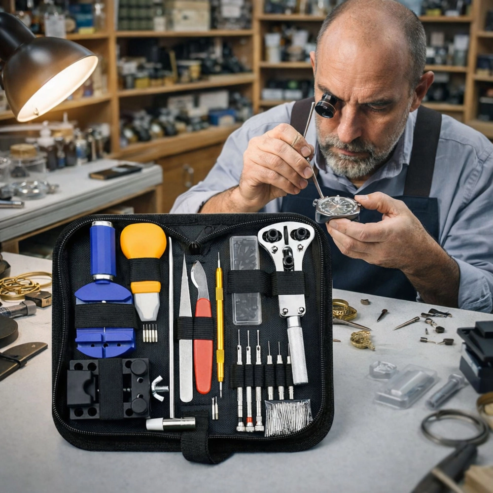 Uitgebreide set met tools voor het openen van deksels, inkorten van armbanden, vervangen van bandpinnen en precieze handling van onderdelen. Het praktische etui houdt alles overzichtelijk geordend.