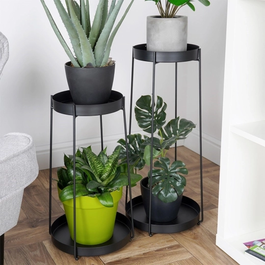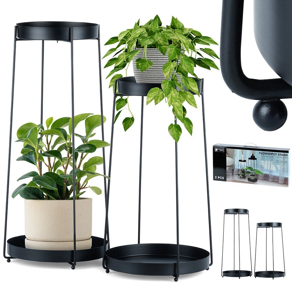 De set bevat twee standaards met hoogtes van 46 en 58 cm met uitneembare schalen voor eenvoudig reinigen en verplaatsen van planten. Dankzij de stabiele metalen constructie dragen ze veilig de meeste gangbare bloempotten en zijn ze ook geschikt voor decoraties en kleine accessoires.