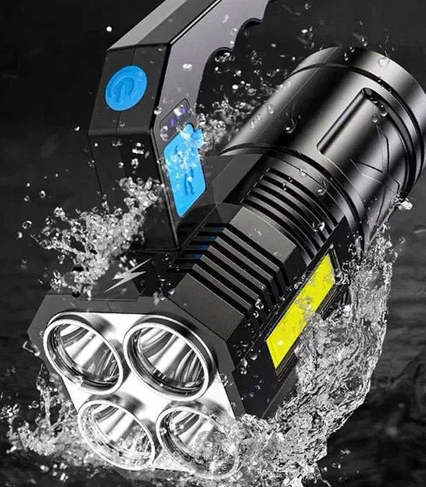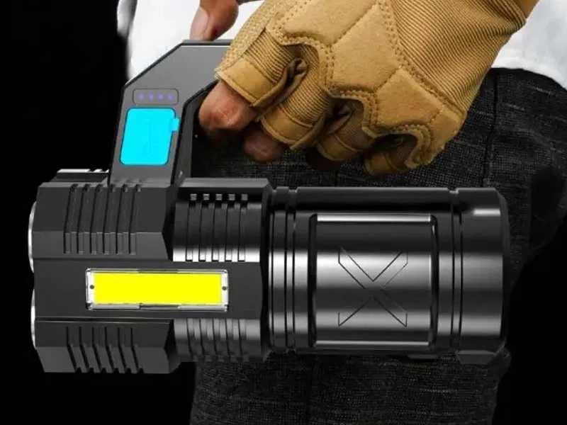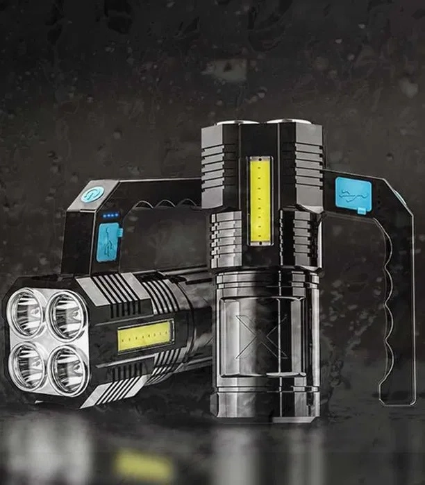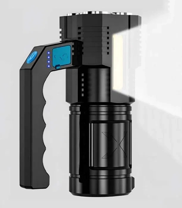 Deze robuuste, waterdichte LED-zaklamp combineert een krachtige hoofdbundel met vier T6-LED’s en praktisch zijwaarts COB-werklicht voor diffuse verlichting zonder verblinding. Opladen gaat gemakkelijk via USB en de hoogwaardige 18650-accu levert betrouwbare prestaties thuis, in de auto en bij outdooractiviteiten.