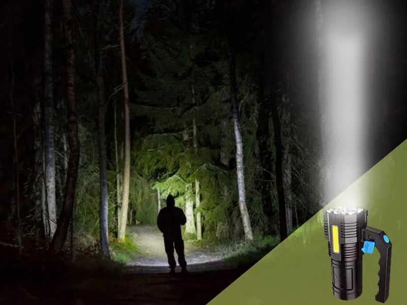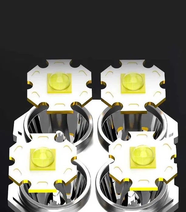 De hoofdbundel met 4× T6 LED levert een krachtige, gerichte straal tot 200 m. Het zijwaartse COB-paneel zorgt voor een brede, aangename werkverlichting zonder verblinding – ideaal voor wandelen, kamperen of reparaties.