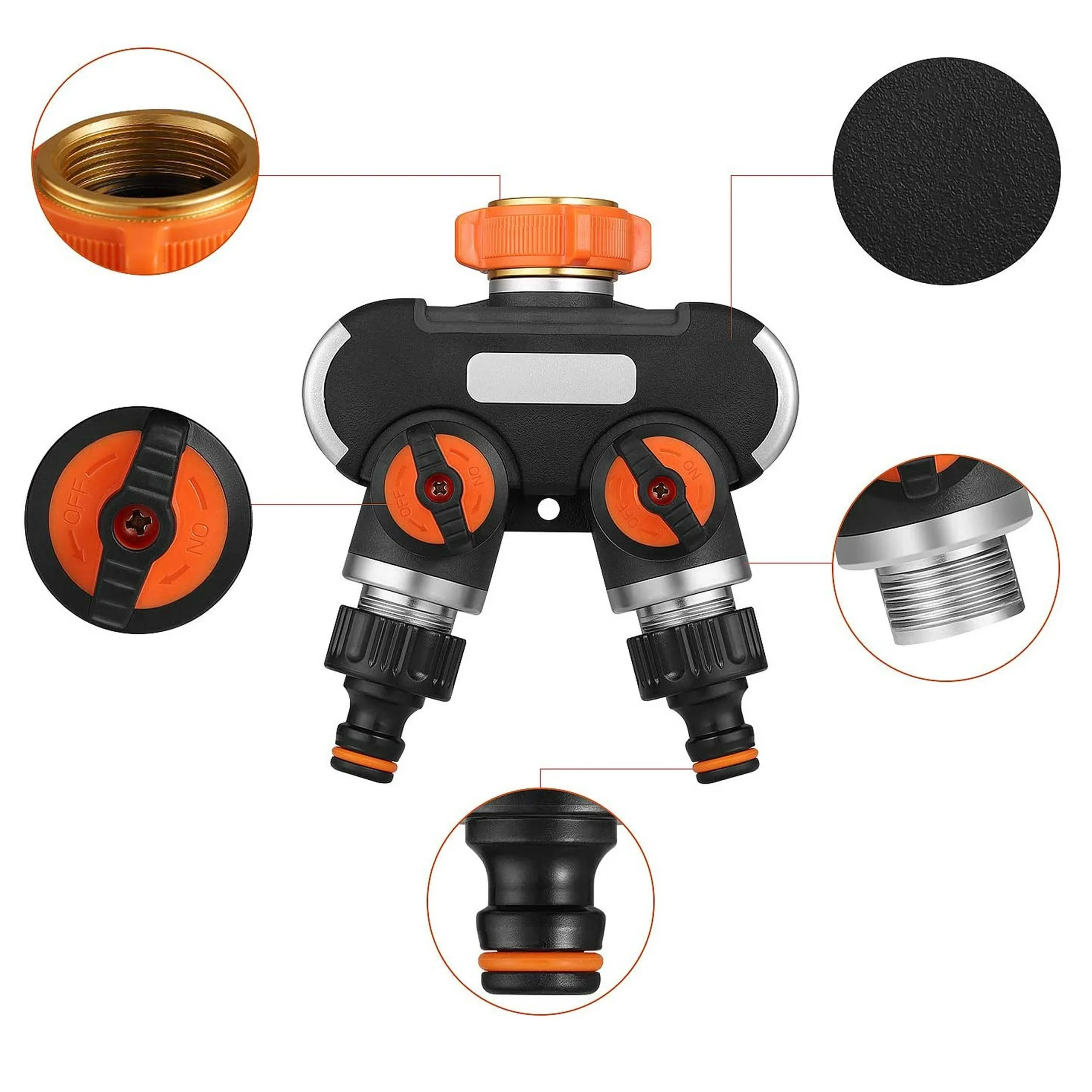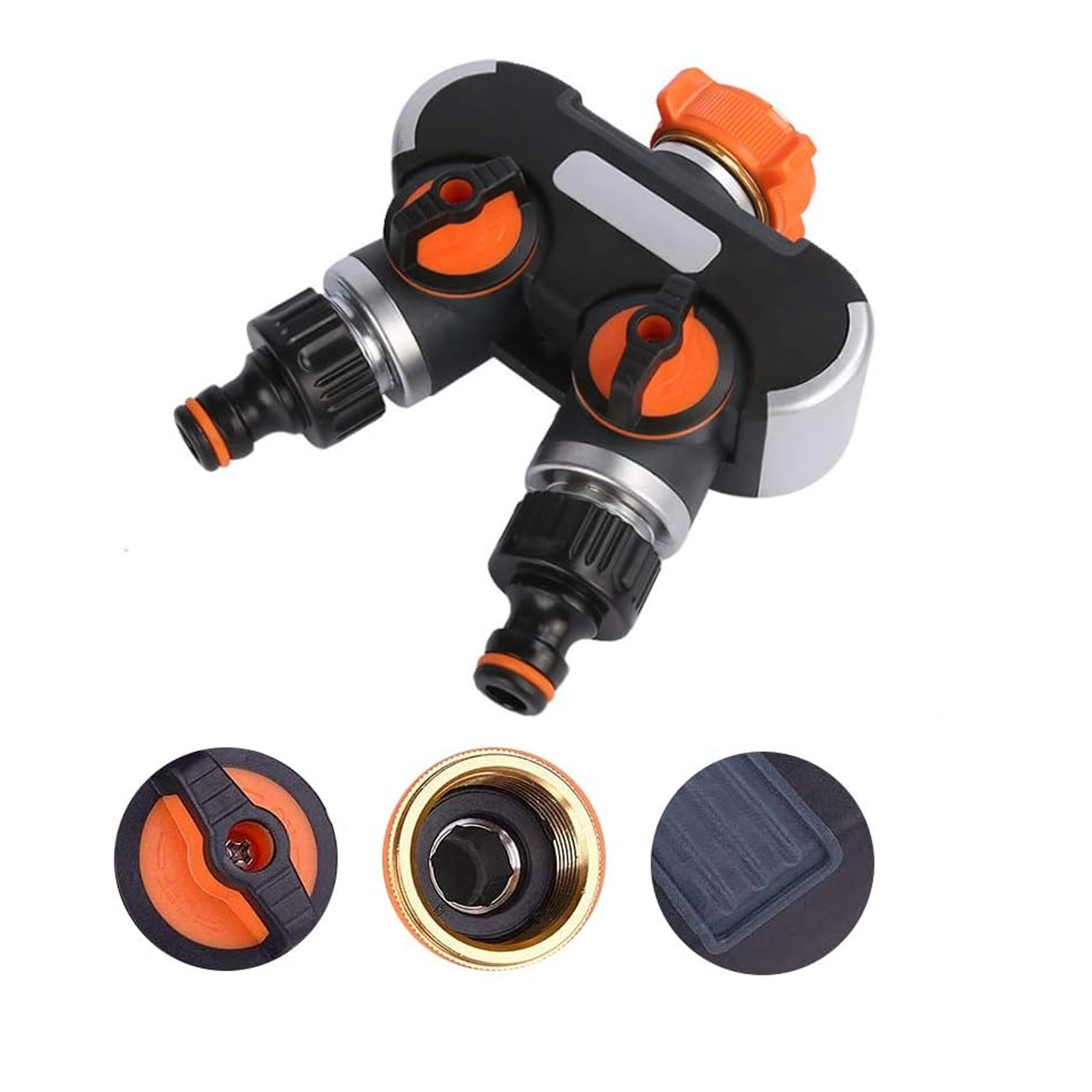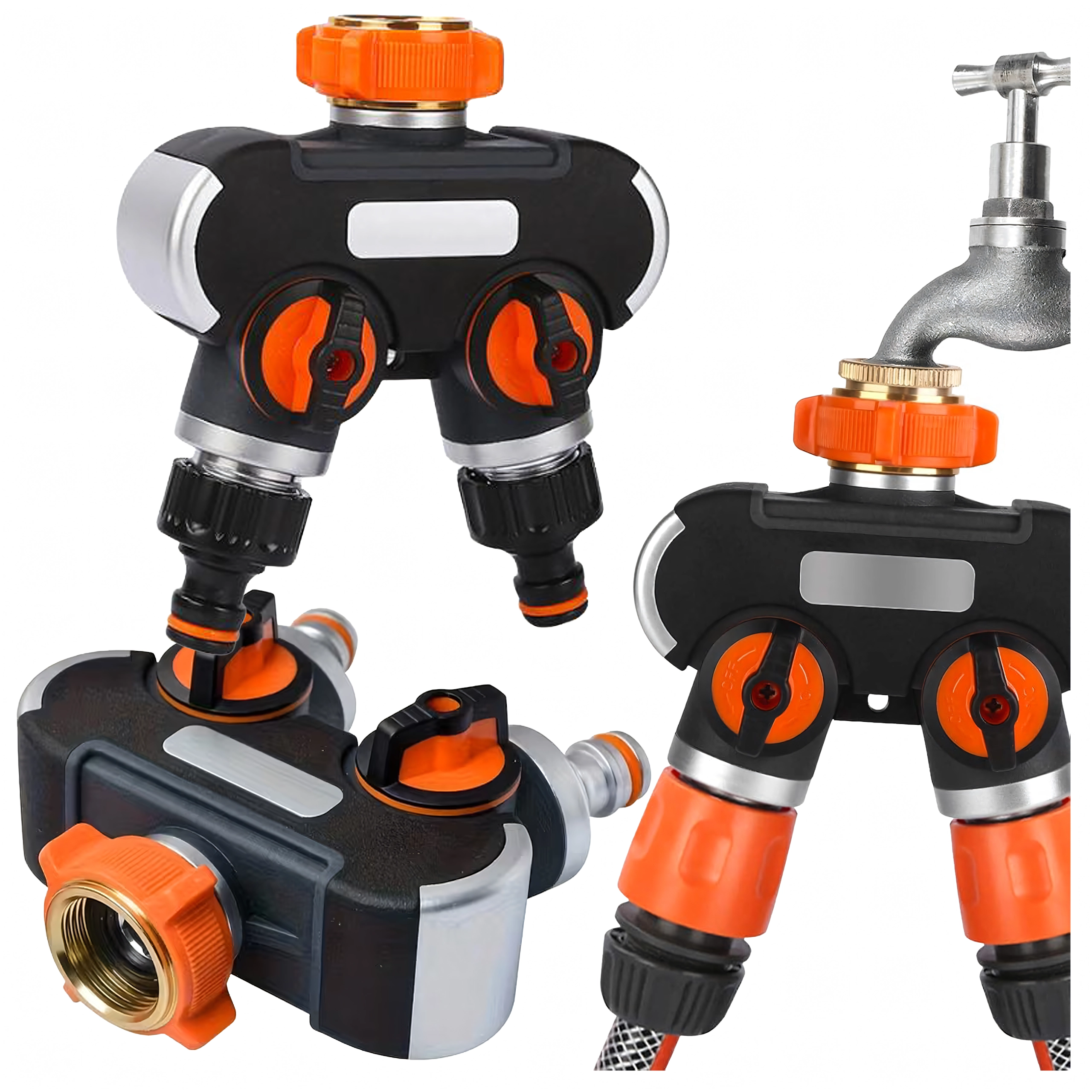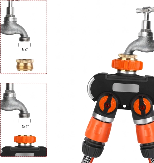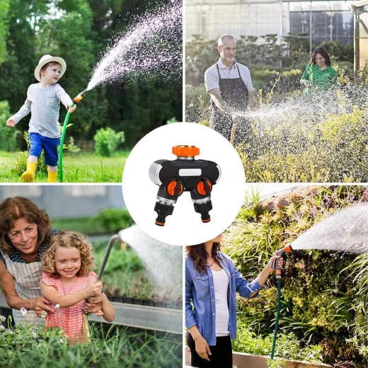 Praktische tweevoudige verdeler maakt van één kraan twee afzonderlijk bedienbare uitgangen. Elke uitlaat heeft een eigen ventiel voor precieze debietregeling en snelkoppelingen voor eenvoudig aansluiten van slangen. Ideaal voor gelijktijdig sproeien en voeden van een sprinkler. Duurzame constructie en ergonomische bedienelementen zorgen voor een lange levensduur en comfortabel gebruik. Tweeweguitgang, onafhankelijke debietregeling, snelle slangverbinding, eenvoudige montage.
