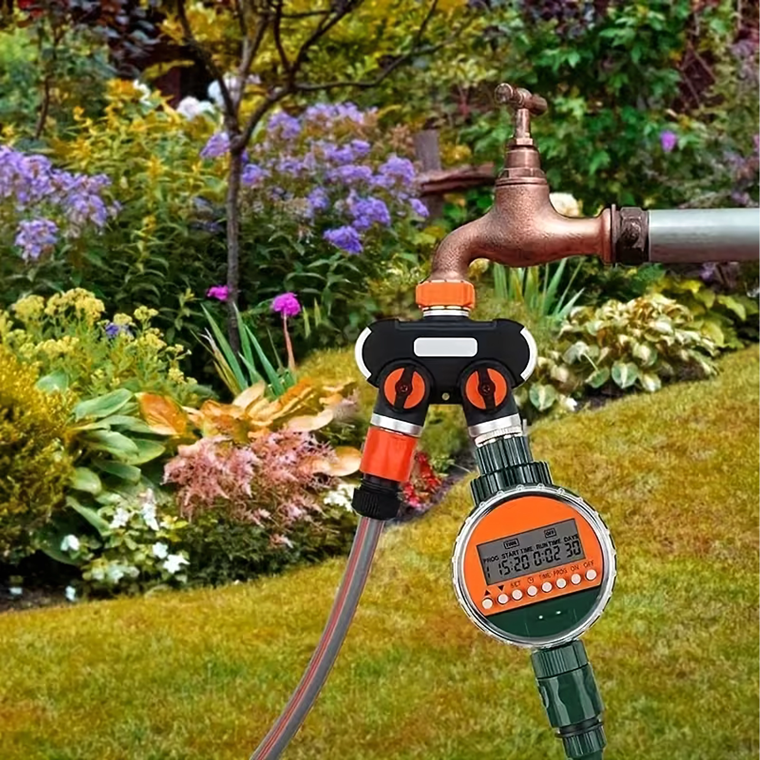 De robuuste behuizing met kwaliteitskoppelingen is ontworpen voor langdurig buitengebruik. Ergonomische bedienknoppen liggen goed in de hand, ook nat, en maken snel aanpassen eenvoudig. Een uitstekende oplossing voor tuinen, kassen en erven waar je twee zones tegelijk wilt bedienen.