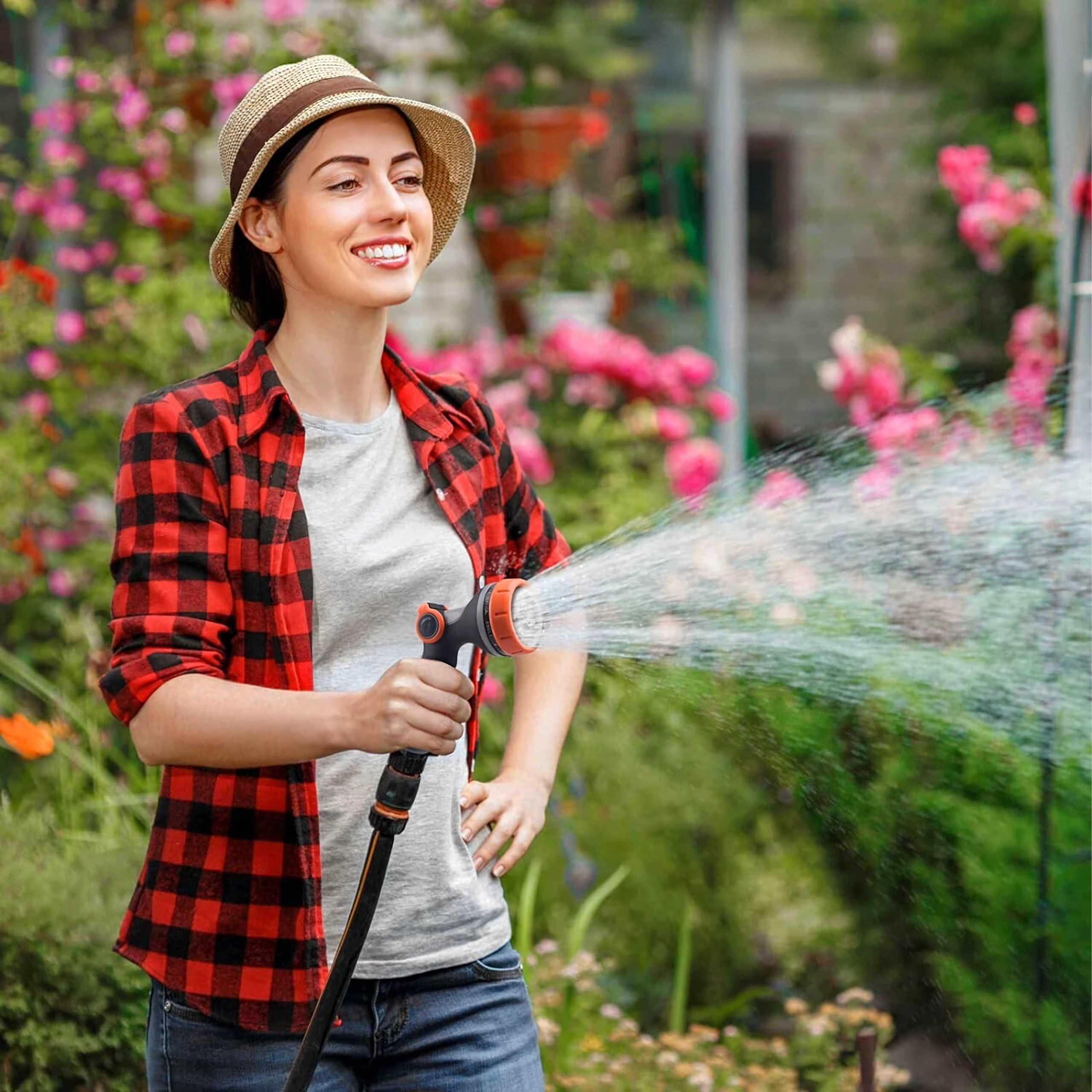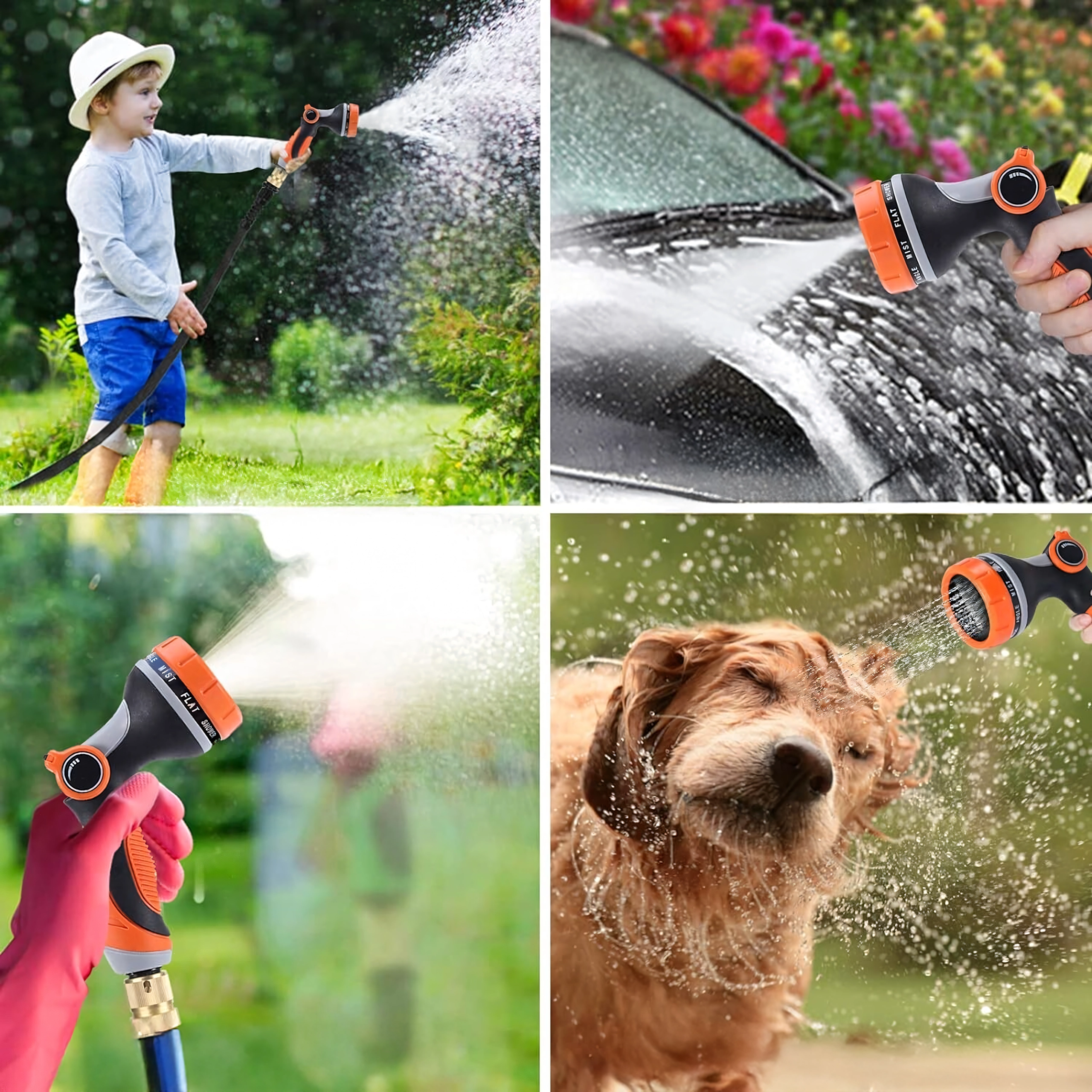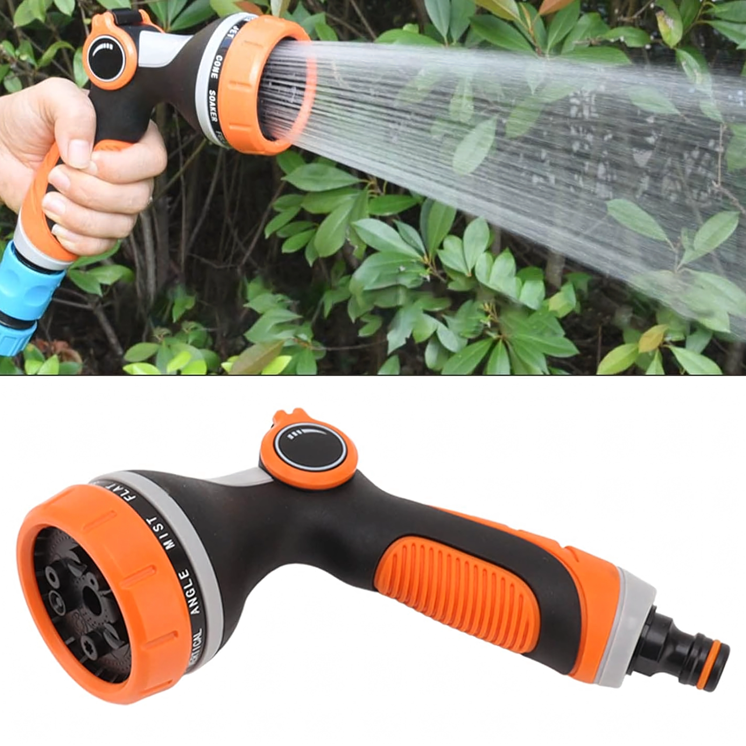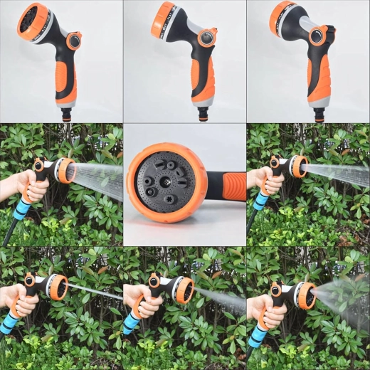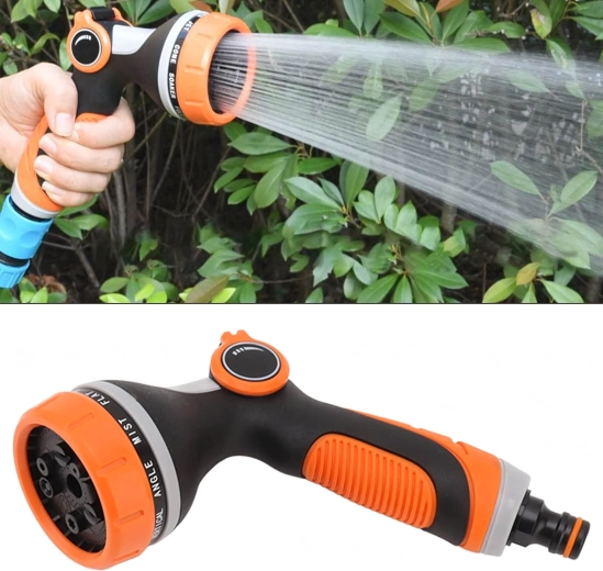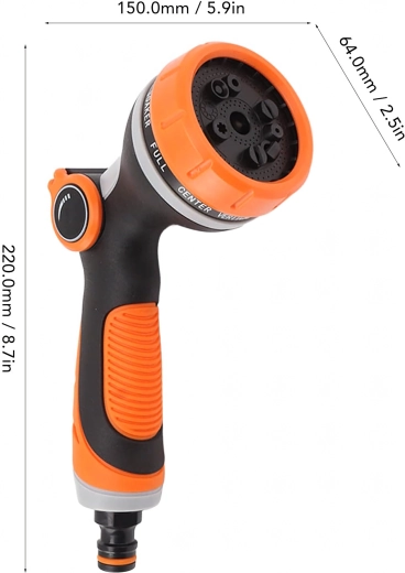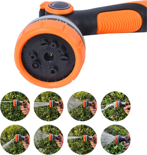 U kunt kiezen uit meerdere sproeistanden (bijv. mist/nevel, full/vol, center/midden, vertical/verticaal, cone/kegel, jet/straal), zodat u bloemen zachtjes begiet, het terras snel afspoelt of fiets en auto wast. De kop is compatibel met een standaard snelkoppeling, waardoor u hem eenvoudig op de meeste slangen aansluit.