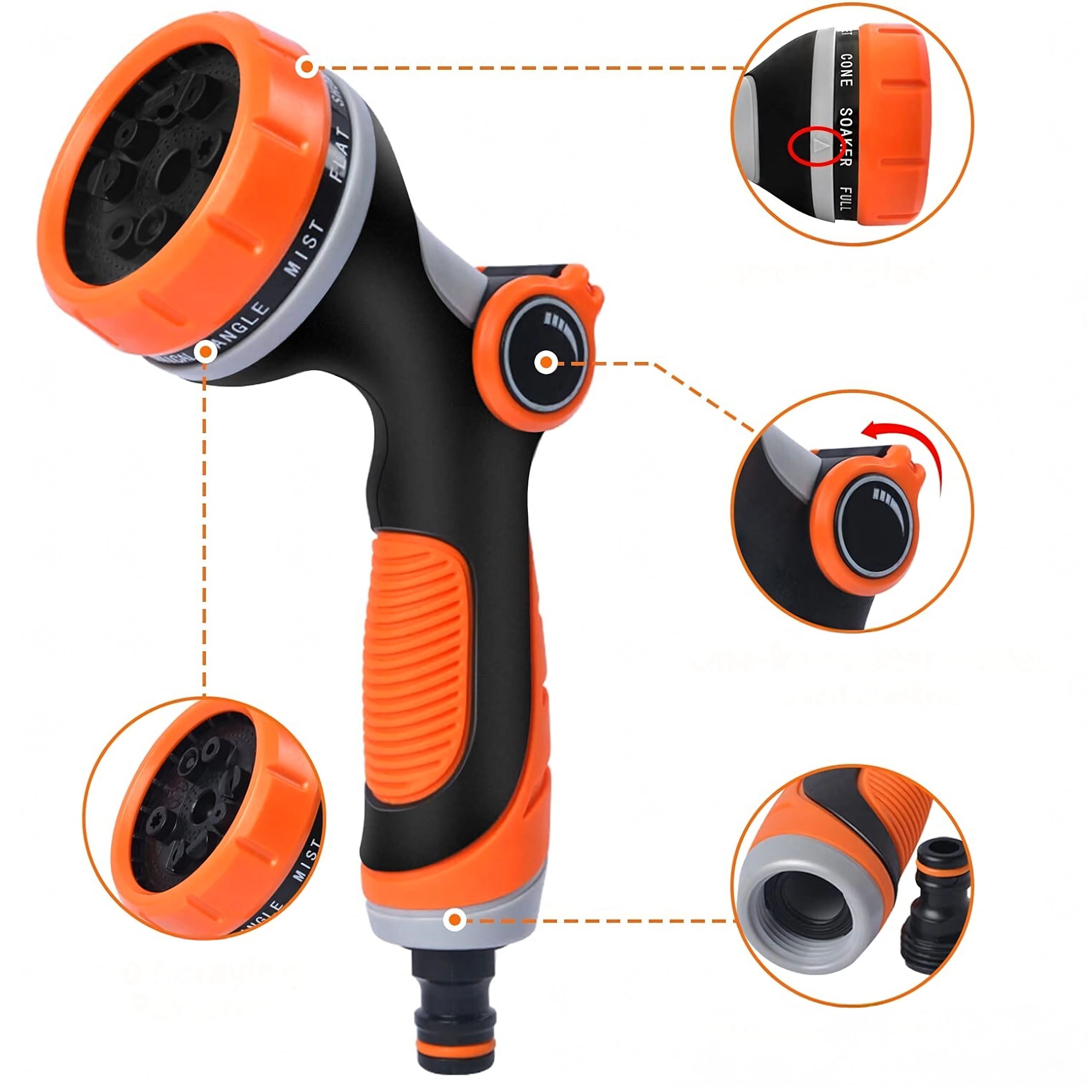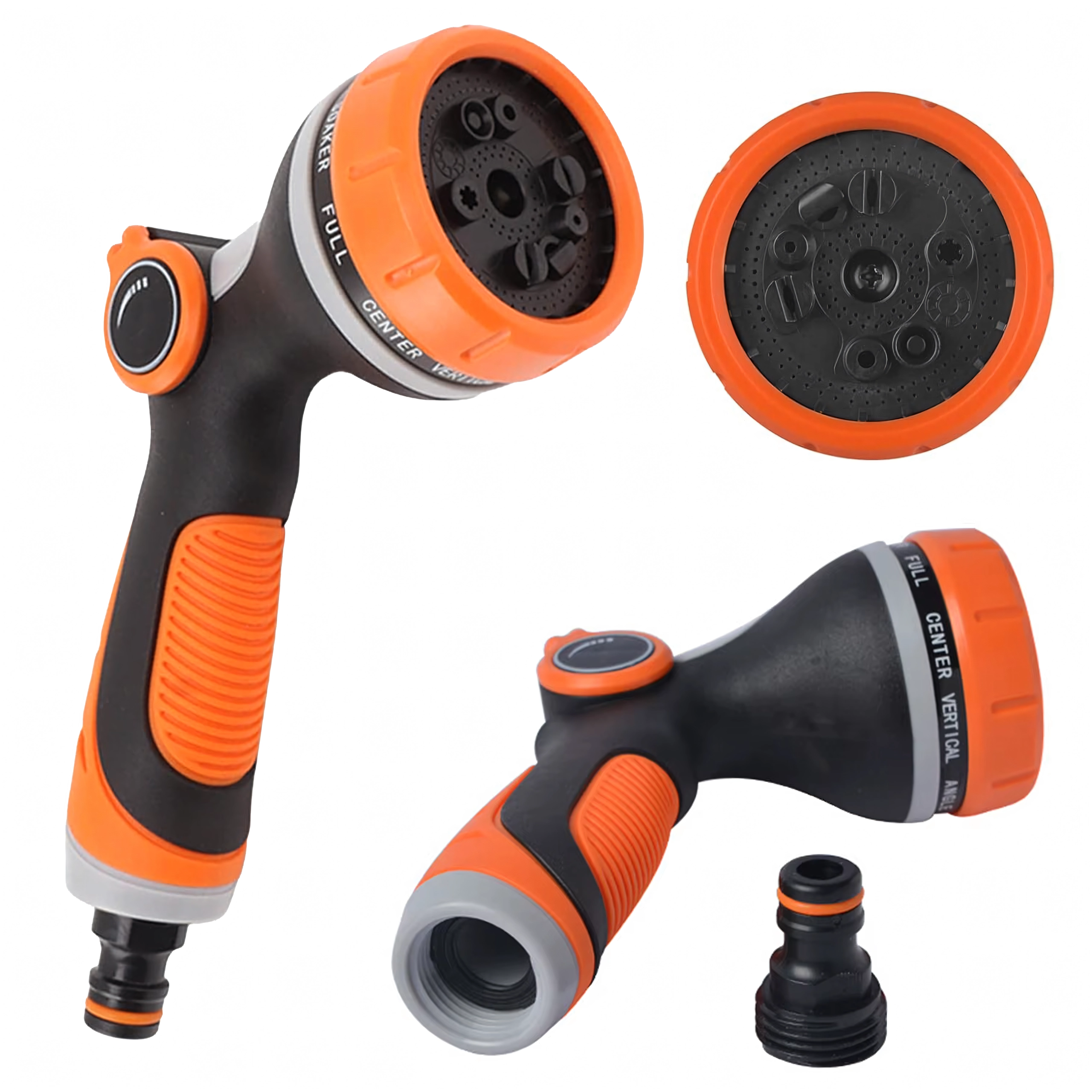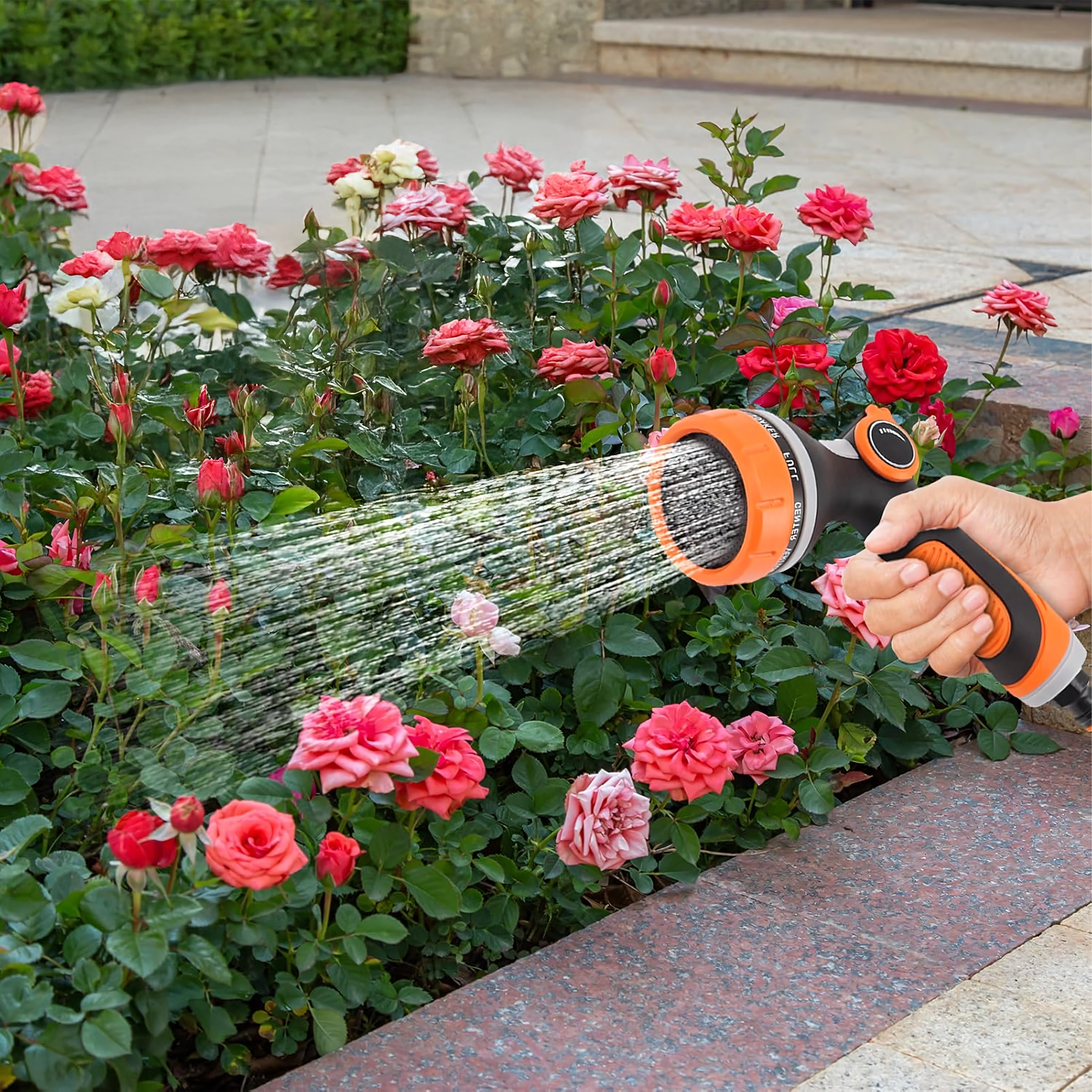 De draaikeuzeschakelaar met duidelijke markeringen (bijv. Full, Center, Vertical, Mist, Jet) laat u snel wisselen van zachte bewatering naar een krachtige straal voor reinigen.