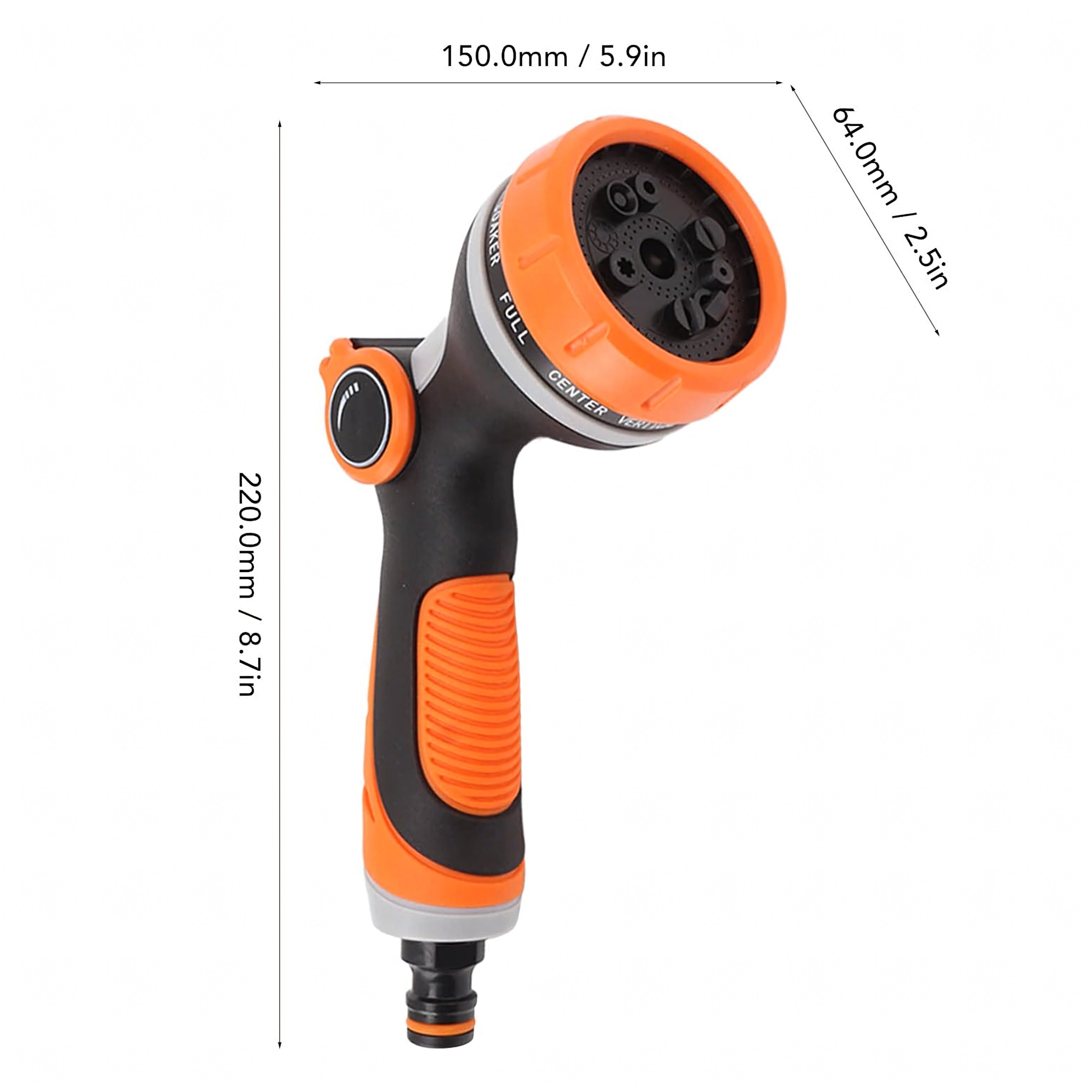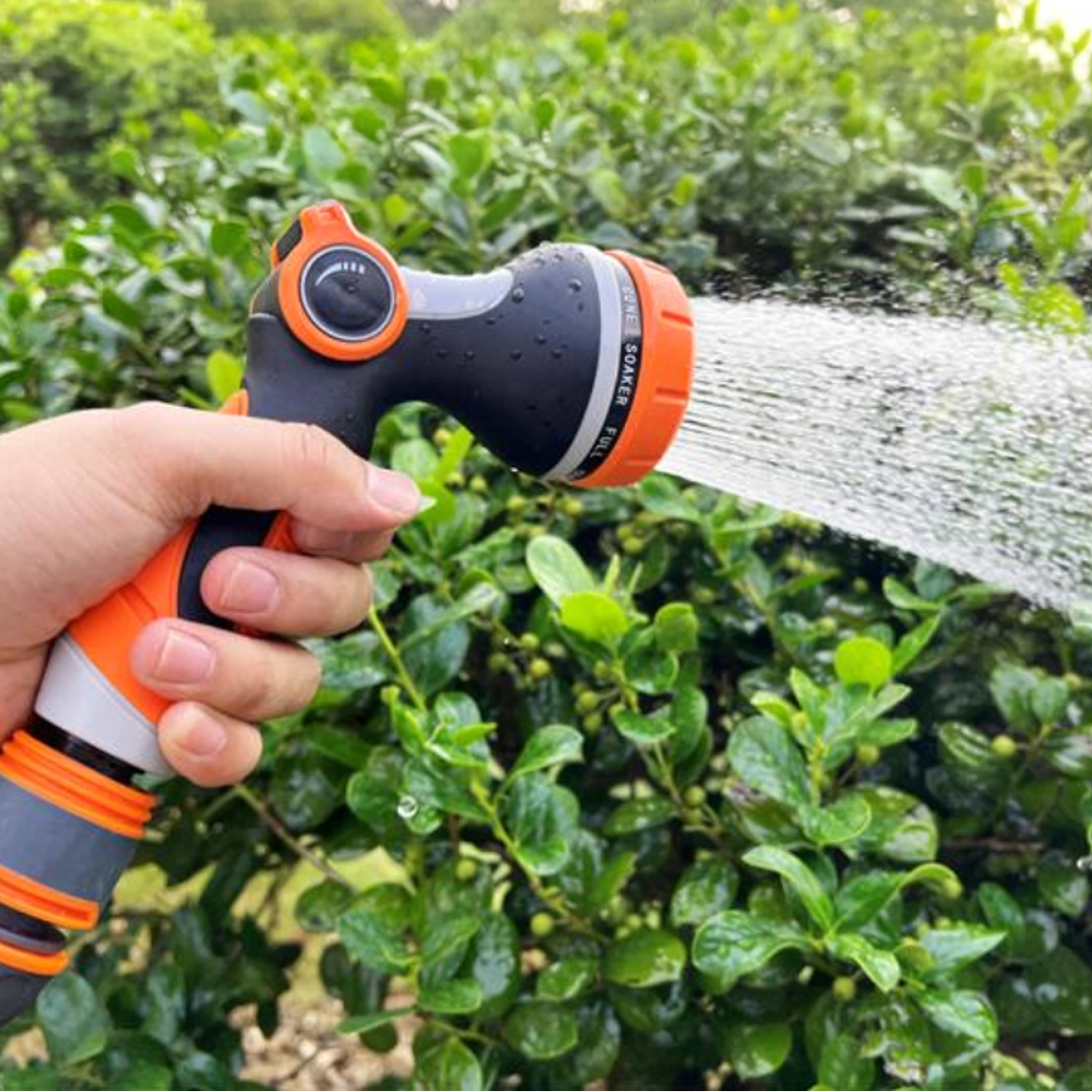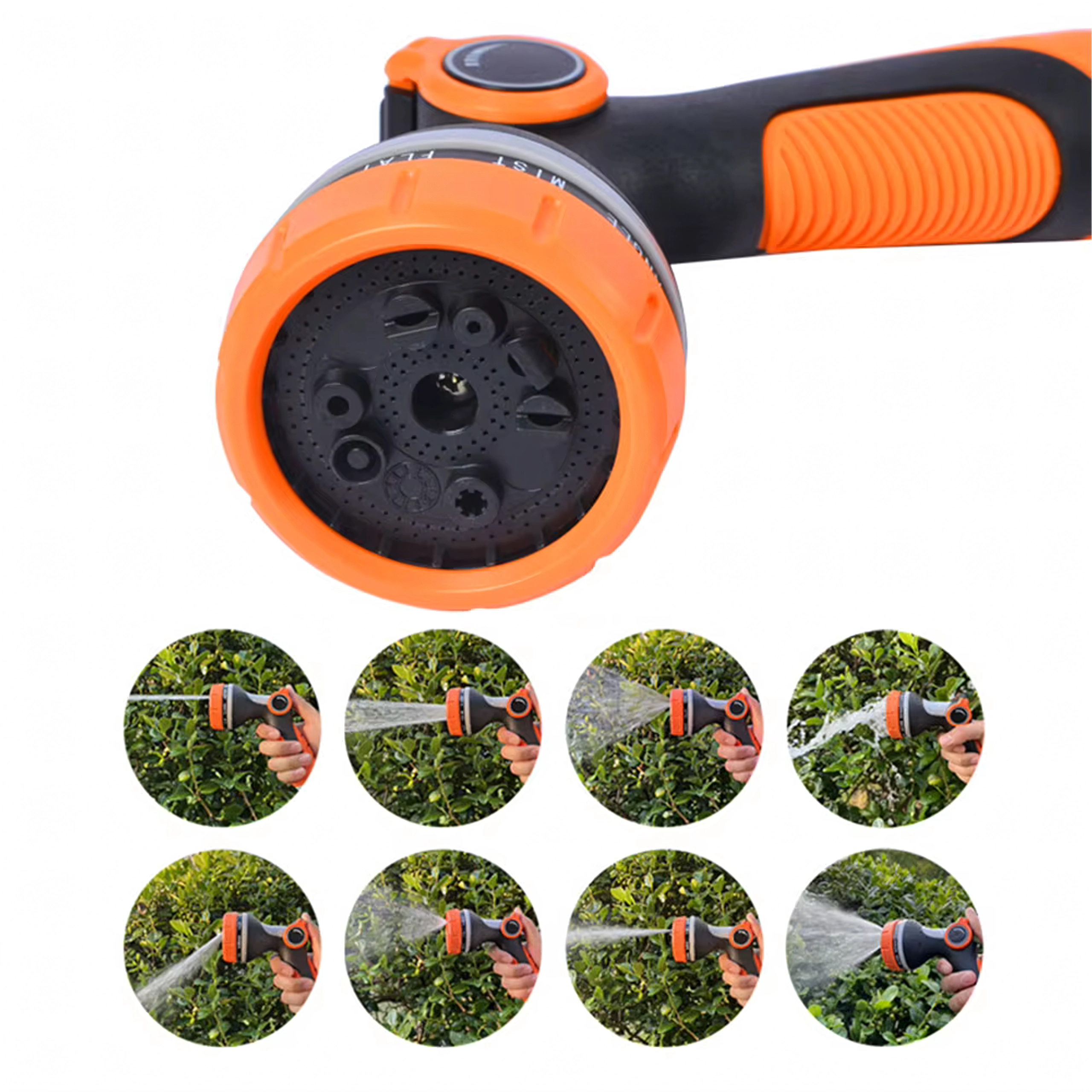 De draaikeuzeschakelaar met duidelijke markeringen (bijv. Full, Center, Vertical, Mist, Jet) laat u snel wisselen van zachte bewatering naar een krachtige straal voor reinigen.