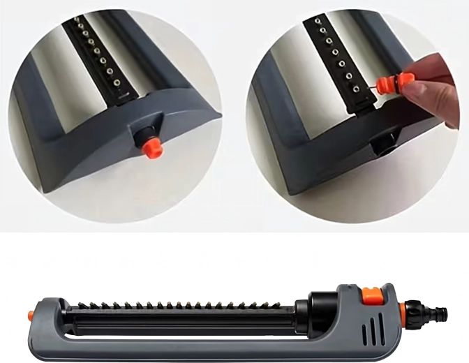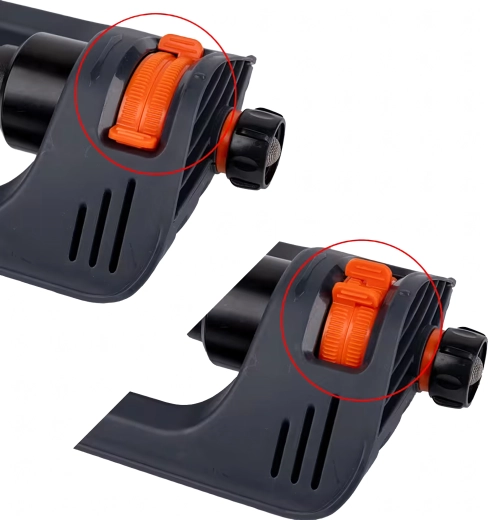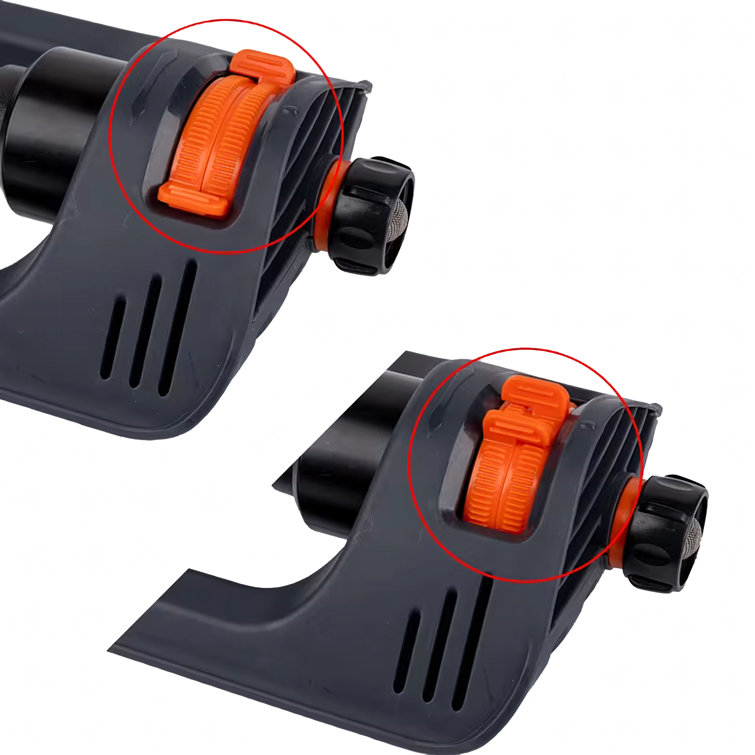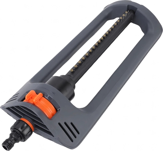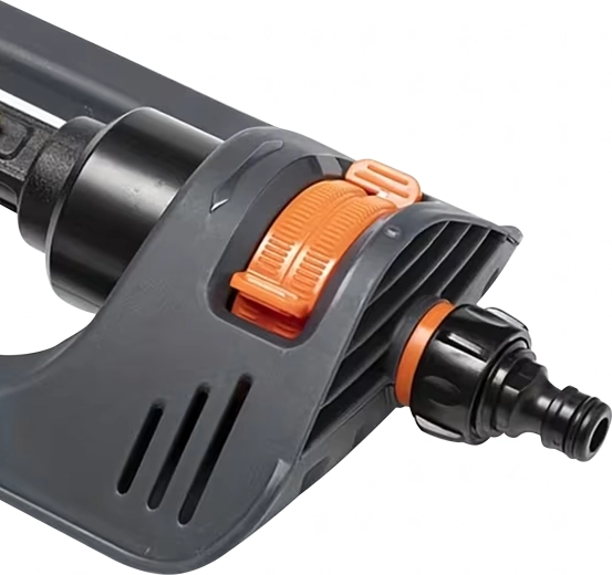 De duurzame constructie met een stabiel laagprofiel frame houdt de sproeier stevig op zijn plaats, terwijl de snelkoppeling de aansluiting op een standaard tuinslang vergemakkelijkt. Bedieningselementen in een opvallende kleur zorgen voor een snelle en intuïtieve instelling van zowel doorstroming als sproeibreedte.