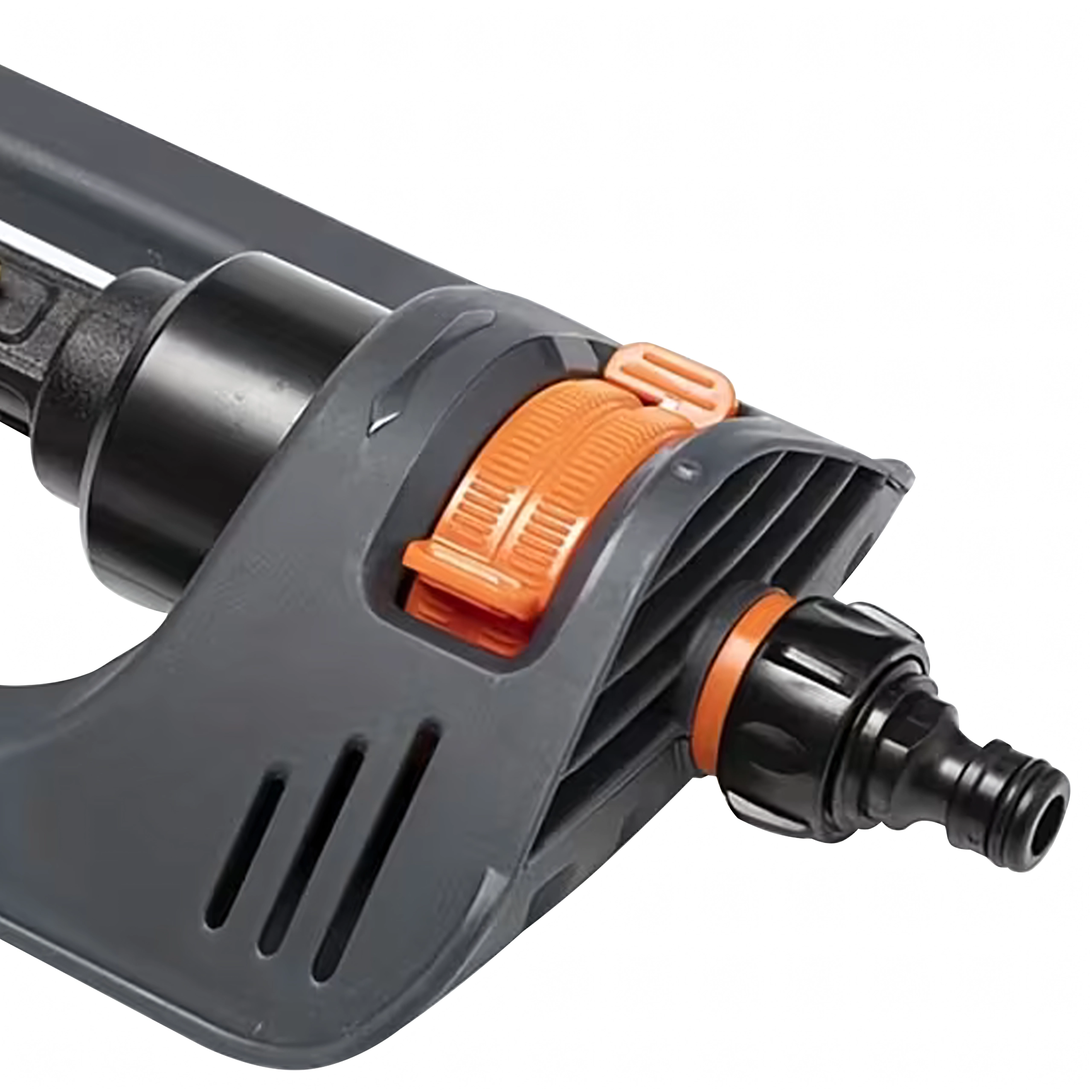 De stevige laagprofielvoet houdt de sproeier op zijn plaats. Een standaard snelkoppeling maakt snelle slangmontage mogelijk.