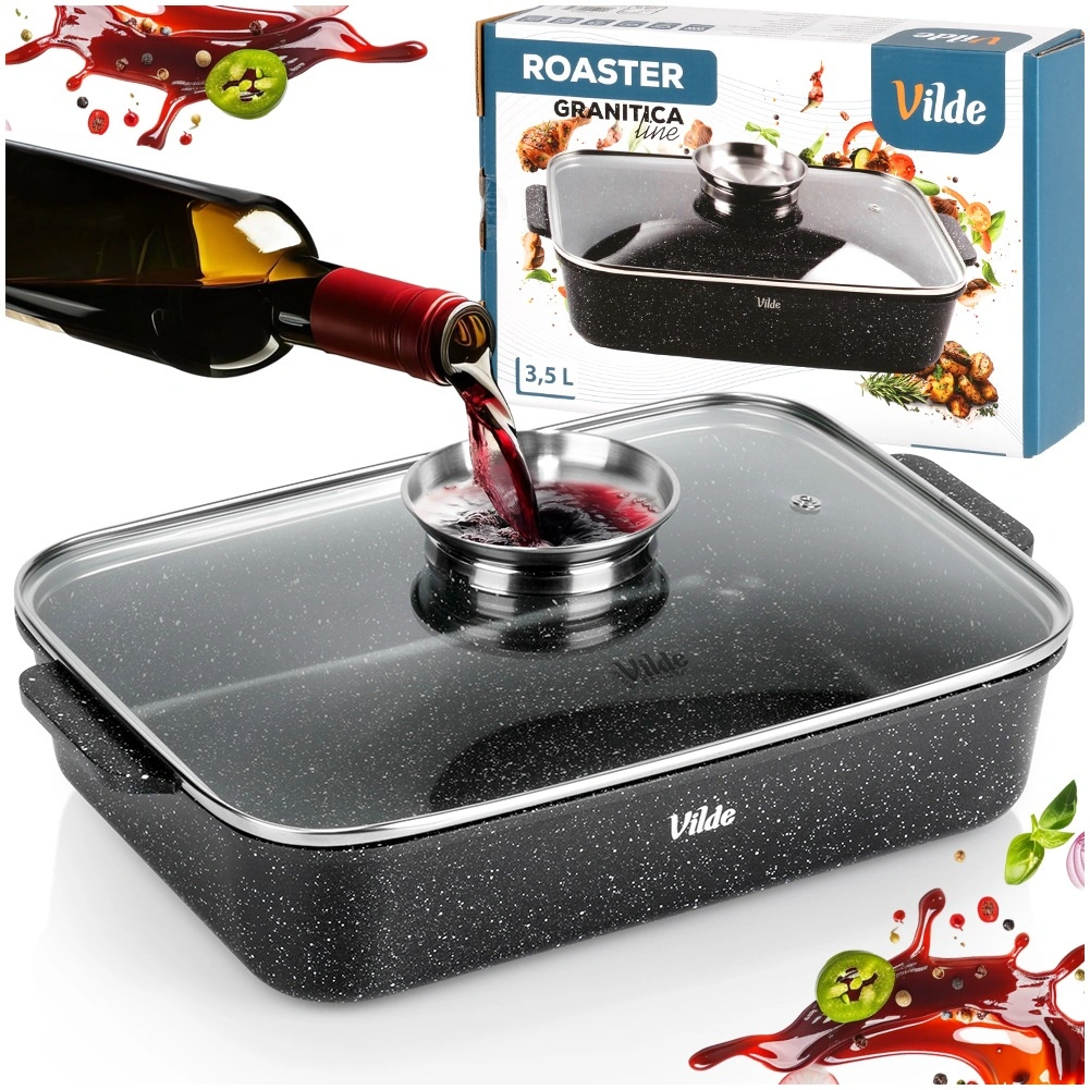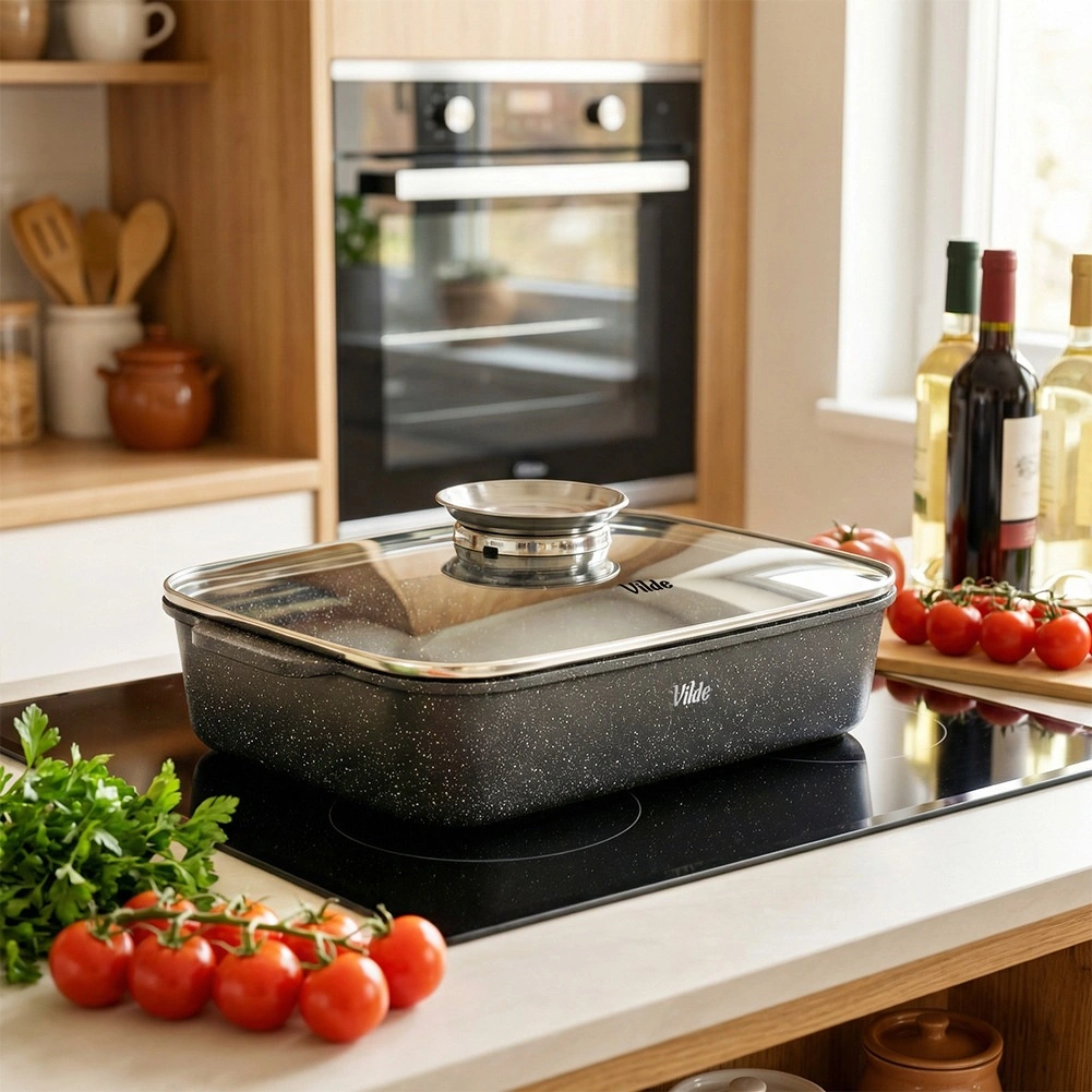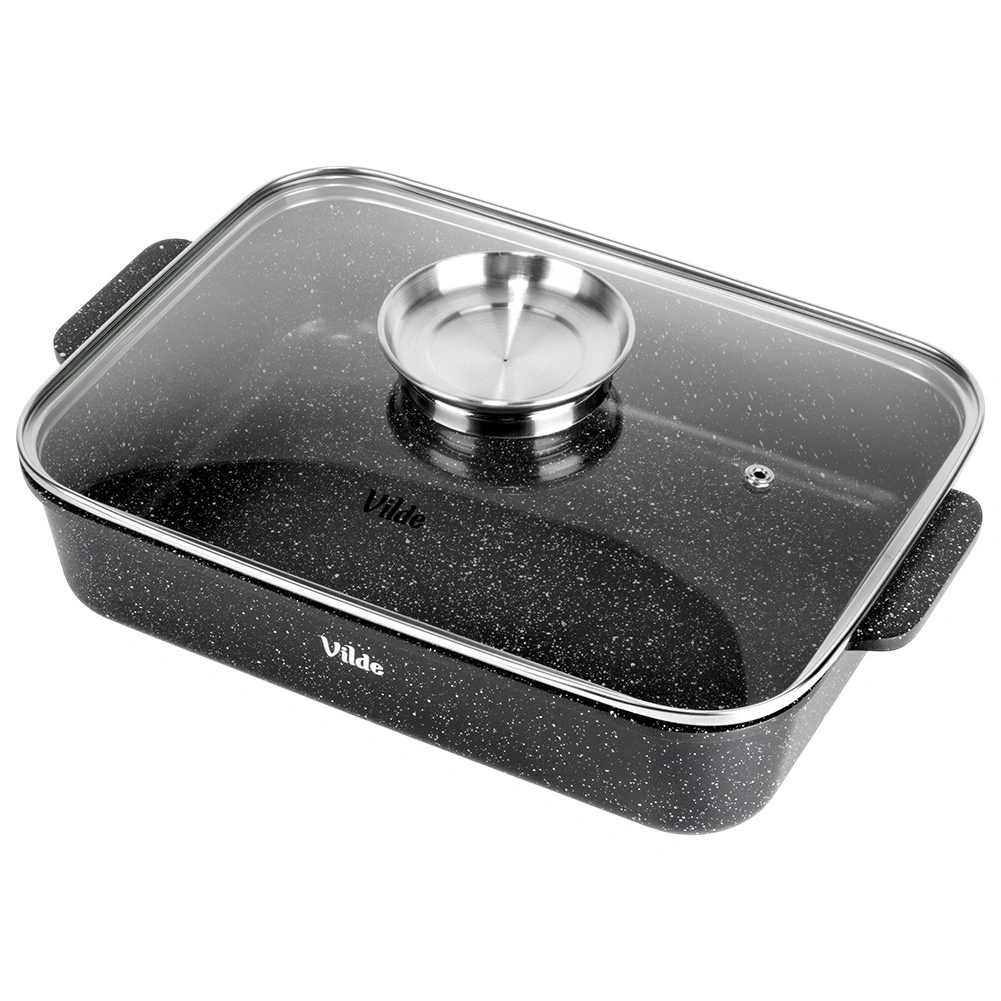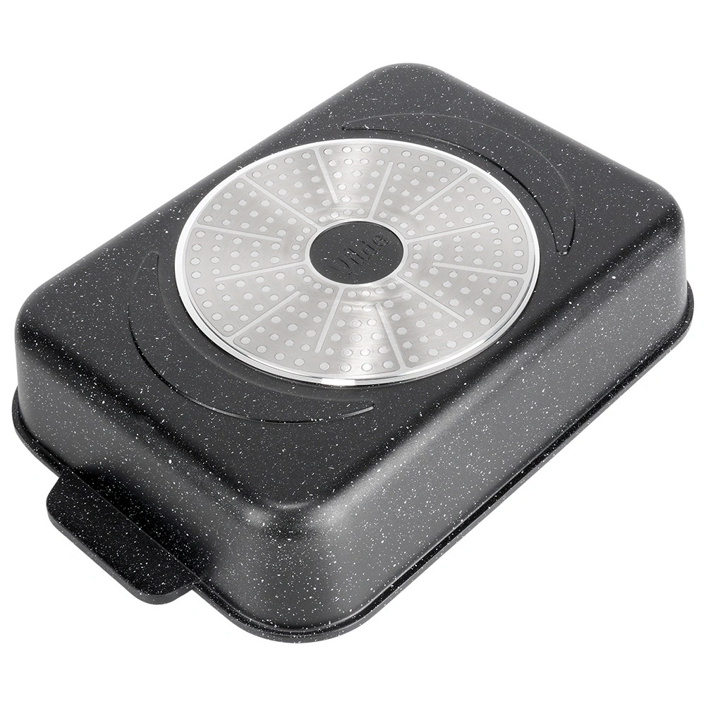De rechthoekige braadslede van gegoten aluminium onder druk met een duurzame granieten anti-aanbaklaag verdeelt de warmte gelijkmatig en houdt gerechten langer warm. Het glazen deksel met stoomventiel en geïntegreerde doseerder voor vloeibare kruiden maakt het mogelijk water of wijn toe te voegen zonder te openen, zodat het gerecht zijn sappigheid en aroma behoudt.