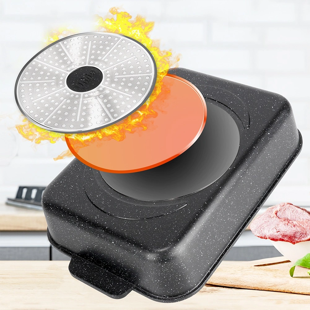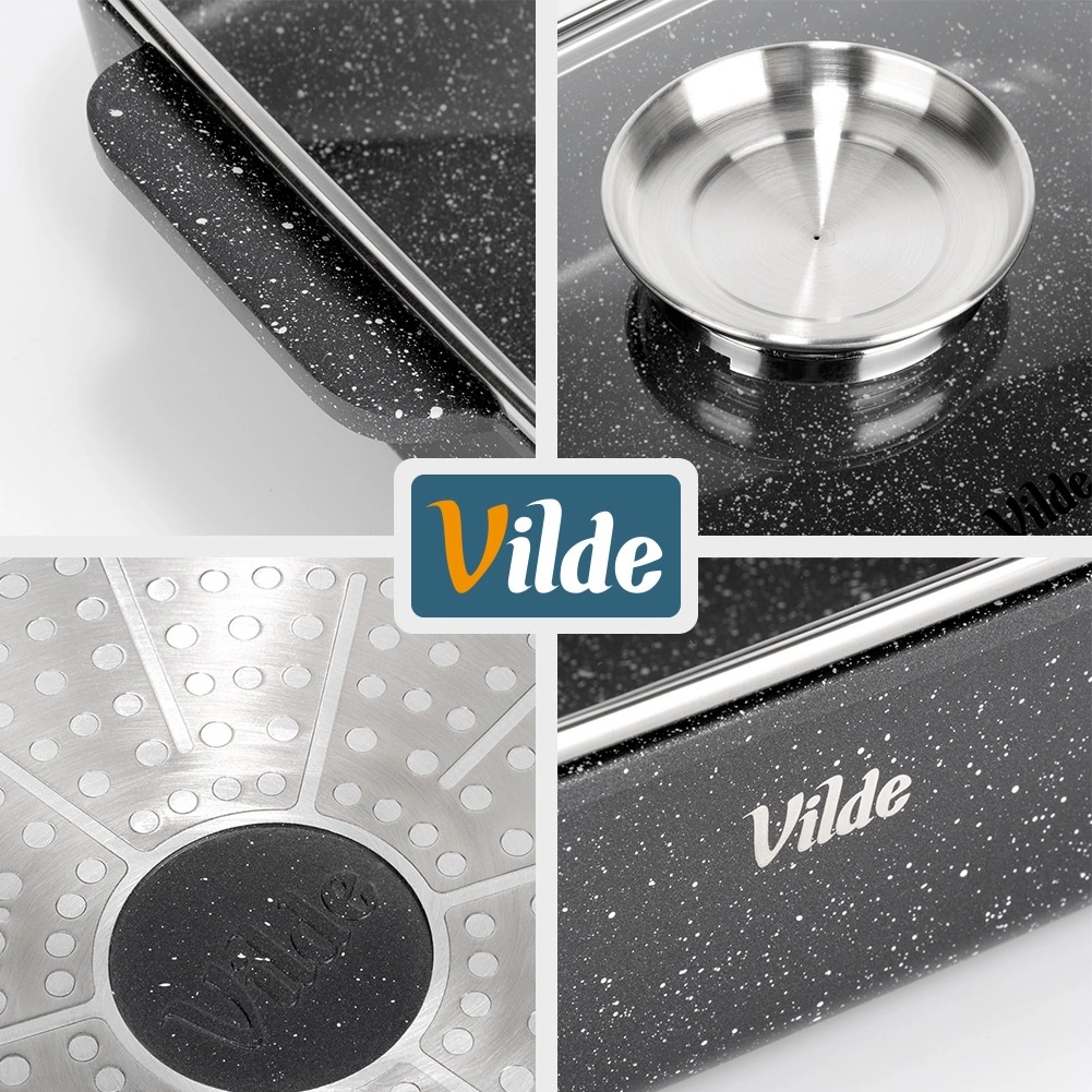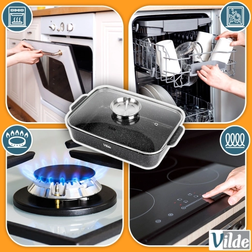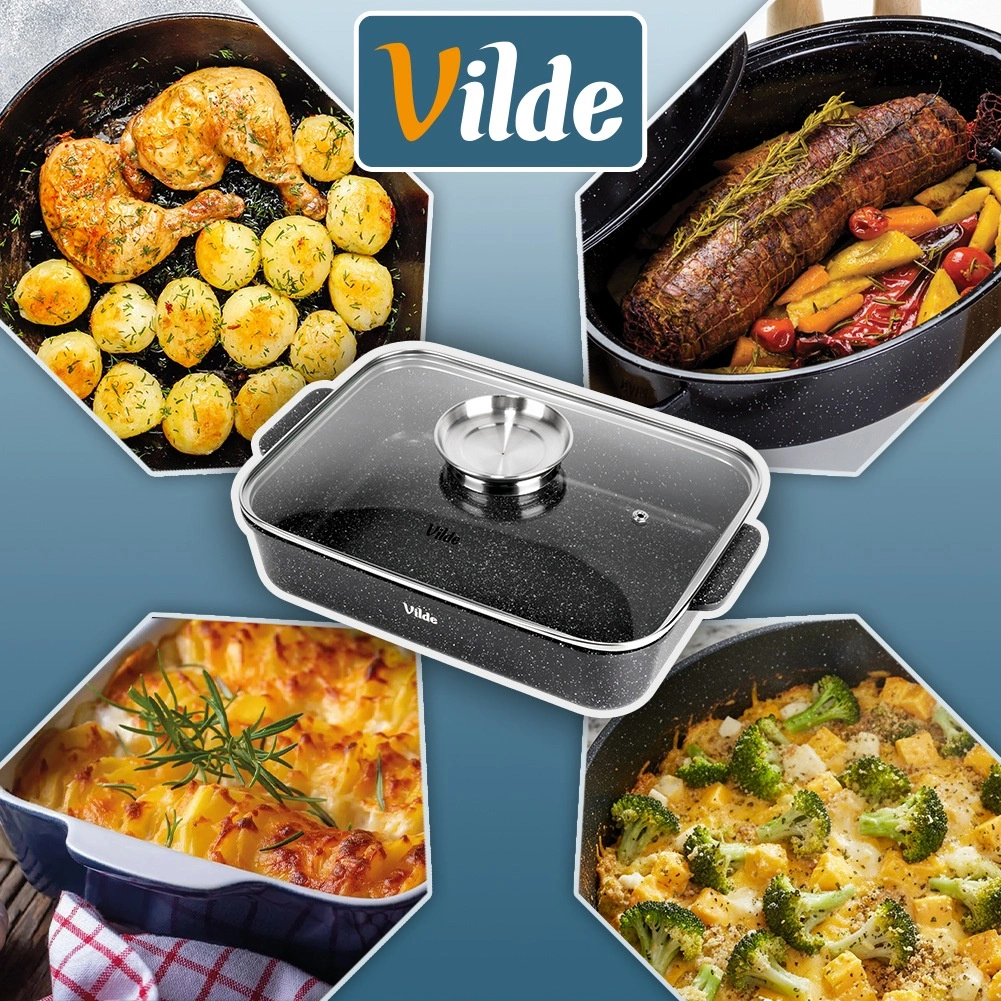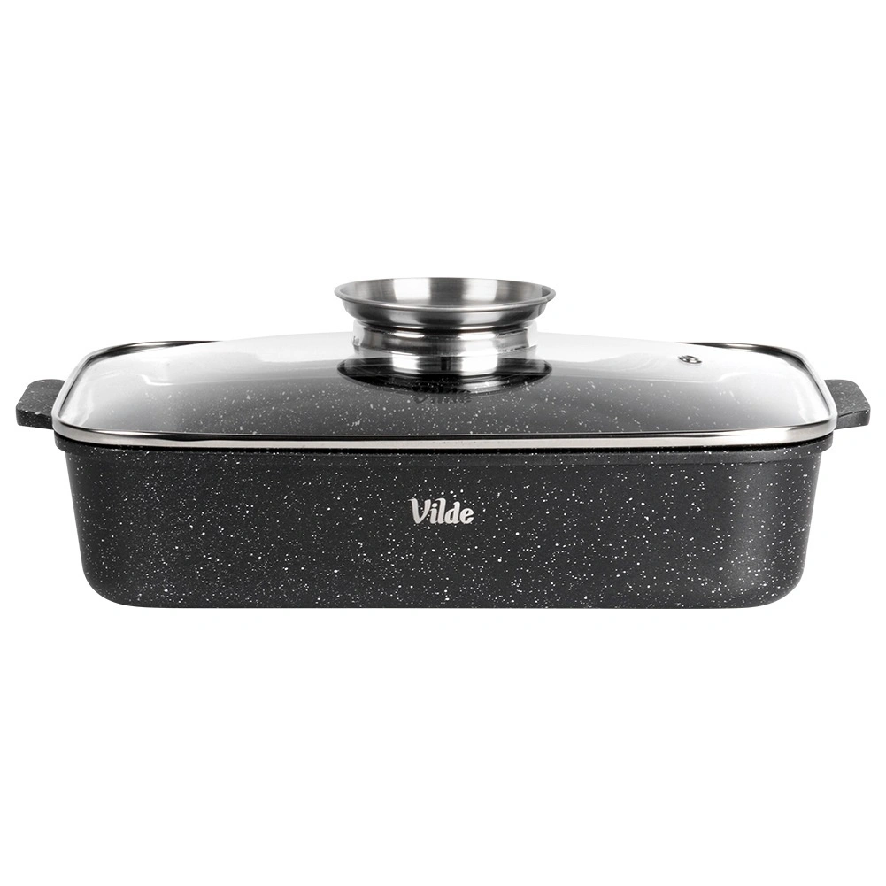 De rechthoekige braadslede van gegoten aluminium onder druk met een duurzame granieten anti-aanbaklaag verdeelt de warmte gelijkmatig en houdt gerechten langer warm. Het glazen deksel met stoomventiel en geïntegreerde doseerder voor vloeibare kruiden maakt het mogelijk water of wijn toe te voegen zonder te openen, zodat het gerecht zijn sappigheid en aroma behoudt.