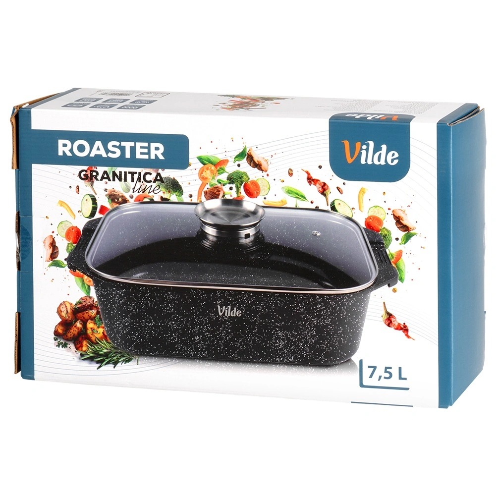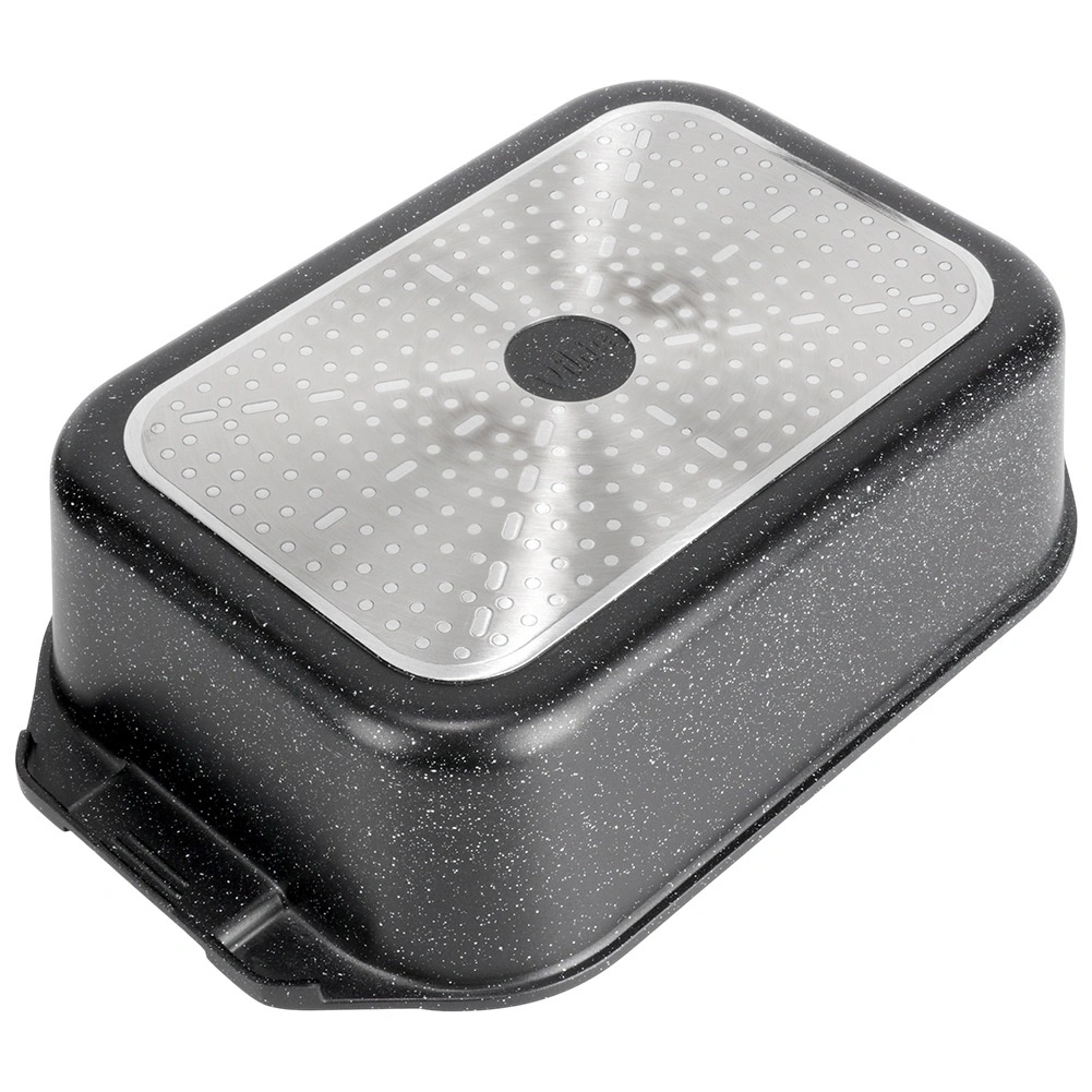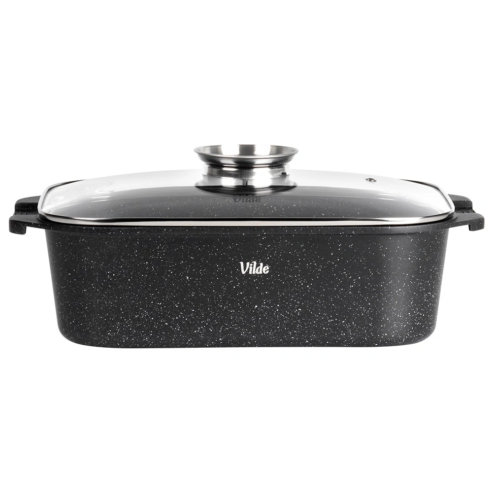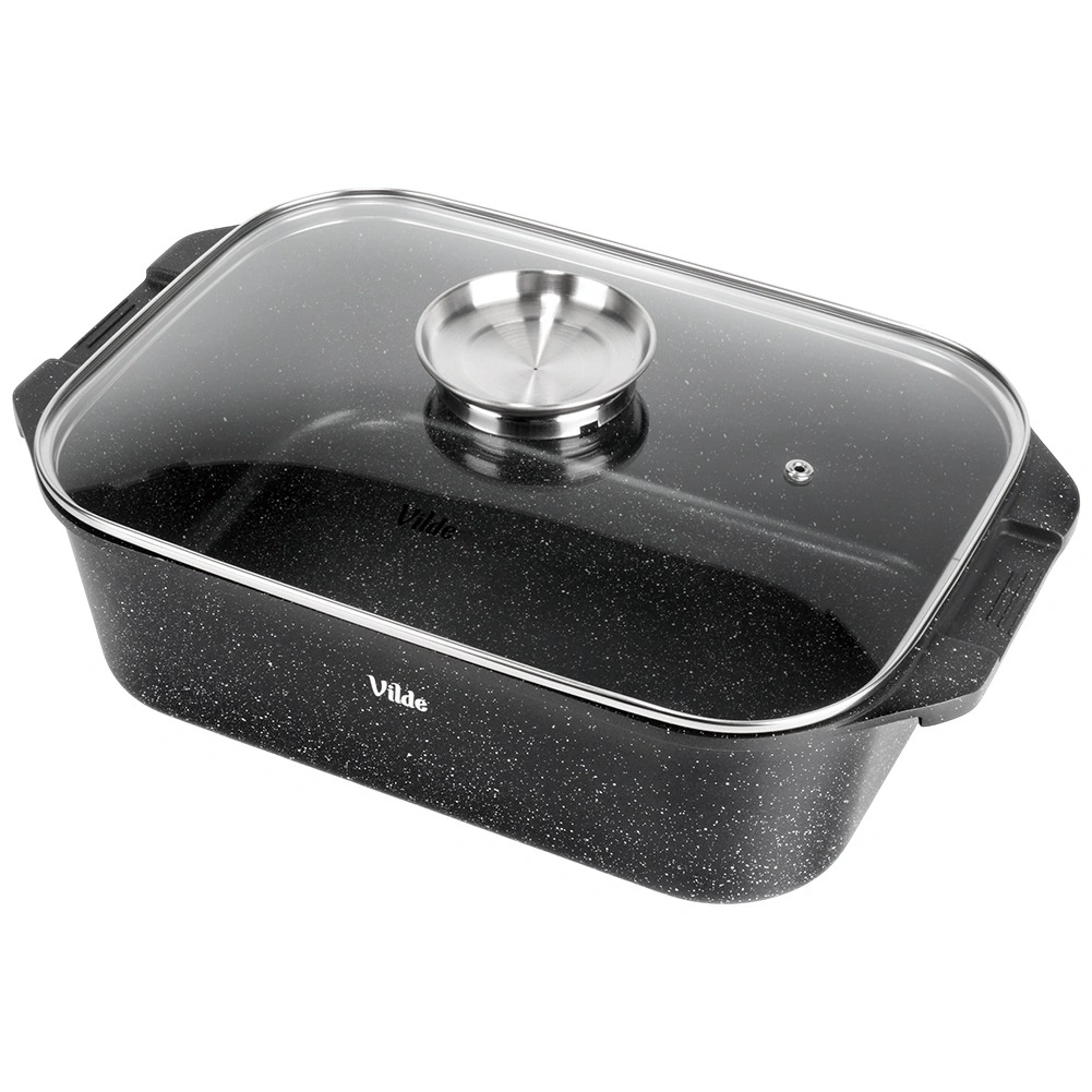 De universele braadslede met afmetingen 41 × 26 × 16 cm (hoogte van de schaal zonder deksel 11 cm) is een betrouwbare hulp voor dagelijks koken. De robuuste gegoten aluminium constructie met een anti-aanbak granietlaag zorgt voor een gelijkmatige warmteverdeling en gemakkelijk lossen van gerechten. Het glazen deksel is hittebestendig en maakt comfortabele controle tijdens de bereiding mogelijk.