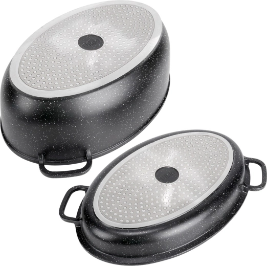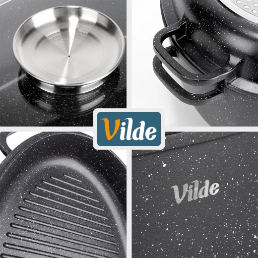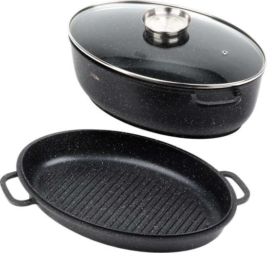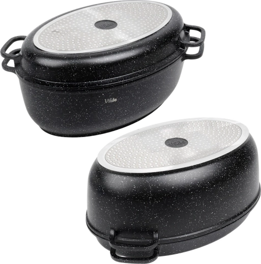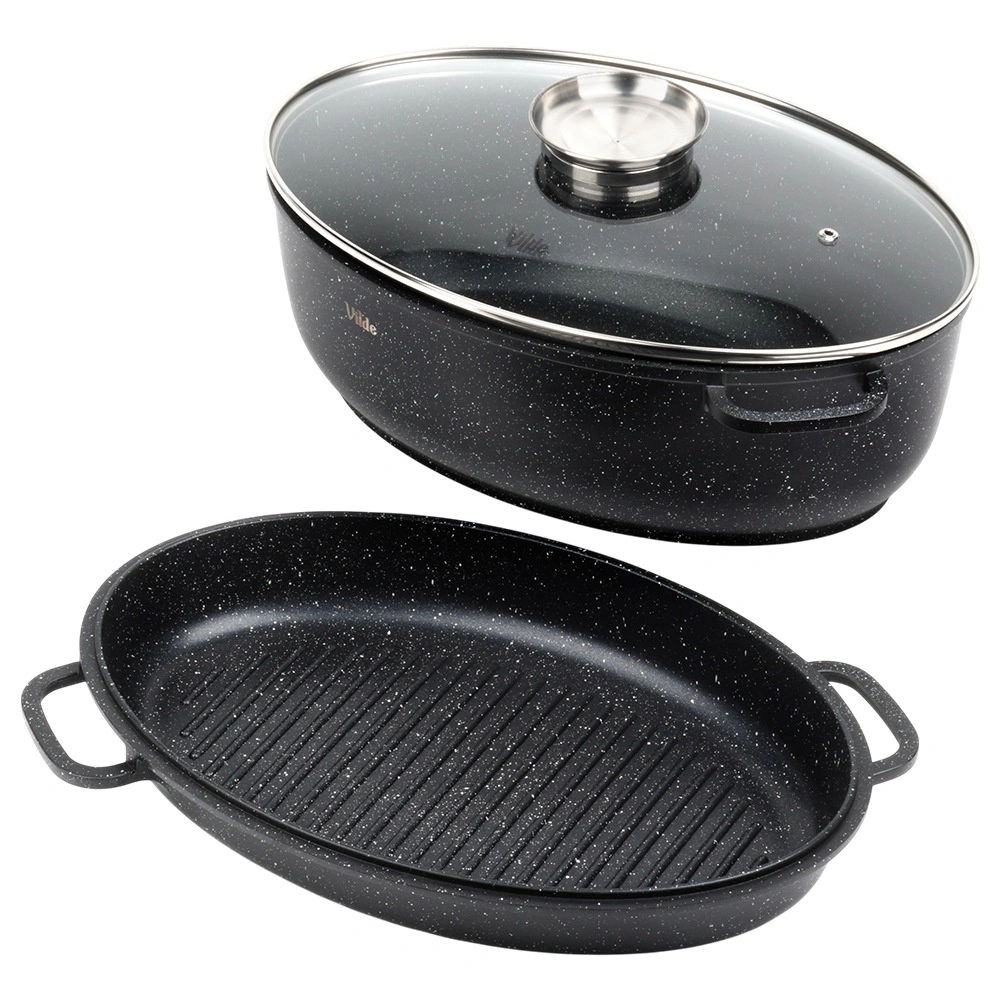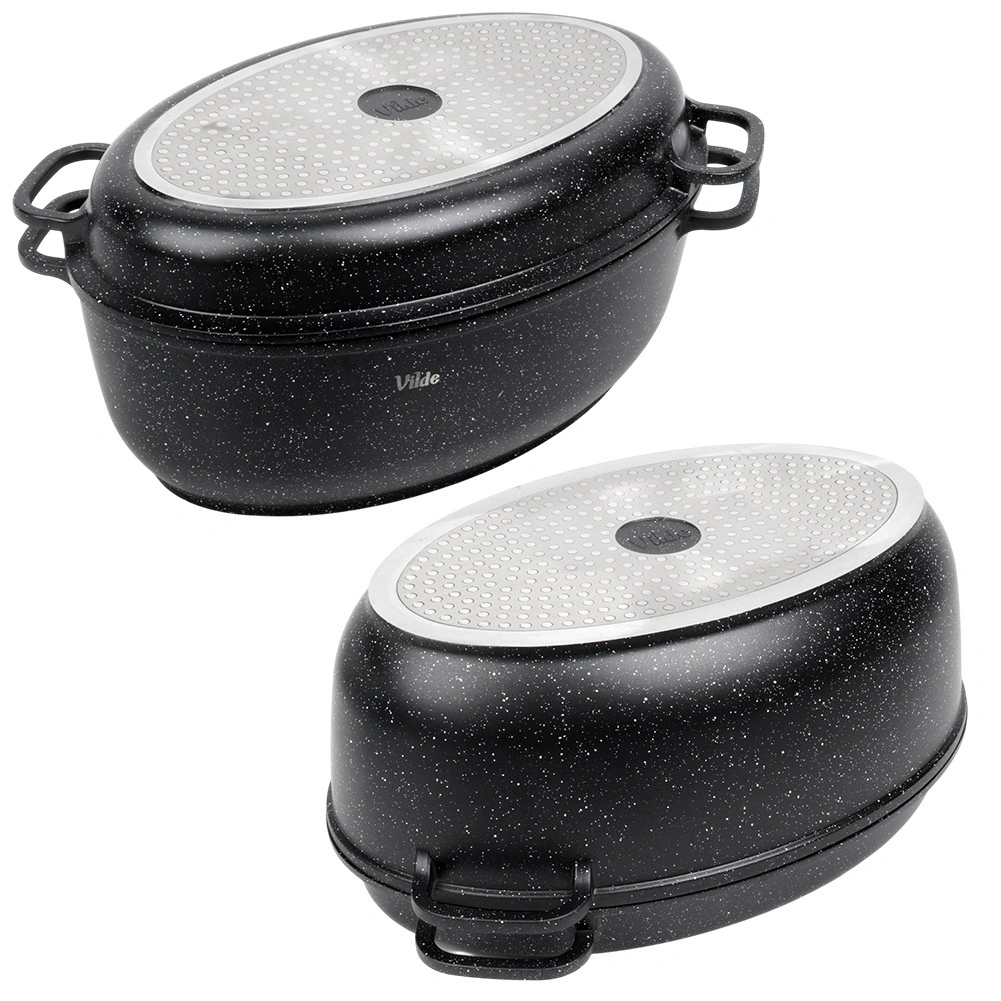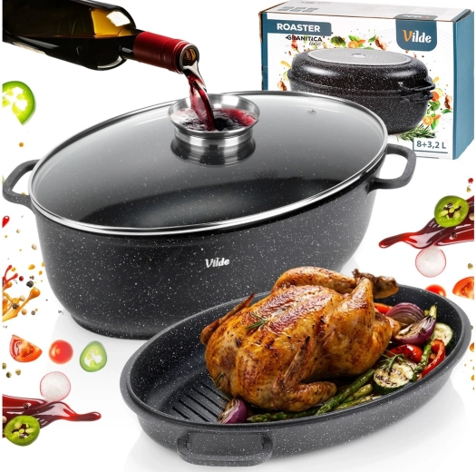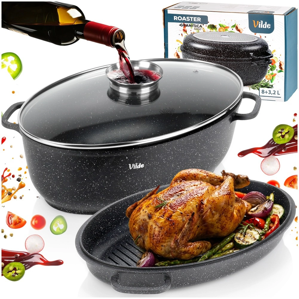 De universele ovale 3-in-1 braadslede van Vilde uit de Granitica-lijn combineert een diepe braadslede van 8 l, een hittebestendig glazen deksel en een grillpan van 3,2 l. Ideaal voor braden, stoven en grillen met minimaal vet dankzij het antiaanbak granieten oppervlak. Geschikt voor inductie, oven en vaatwasser, met glazen deksel met dispenser voor vloeibare kruiden voor eenvoudig bedruipen zonder het deksel op te tillen.