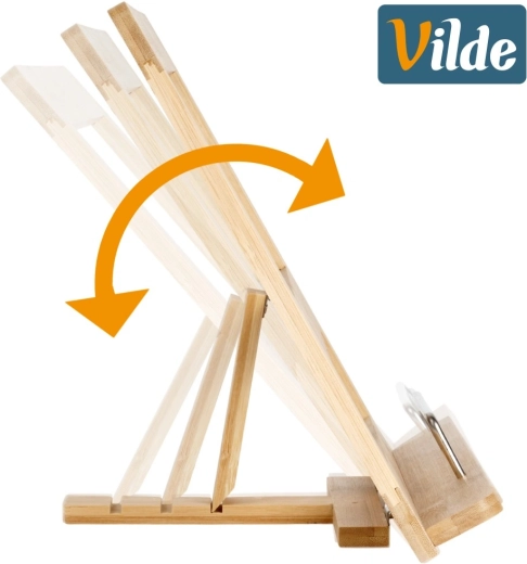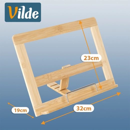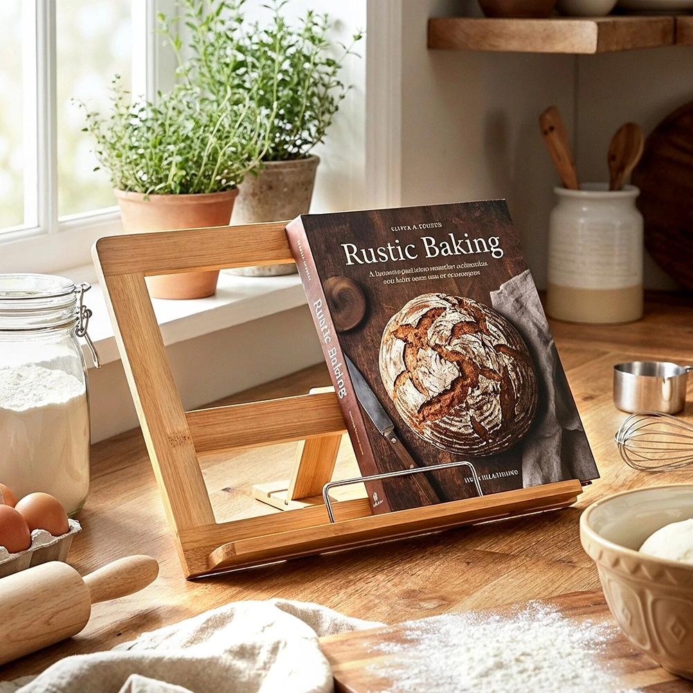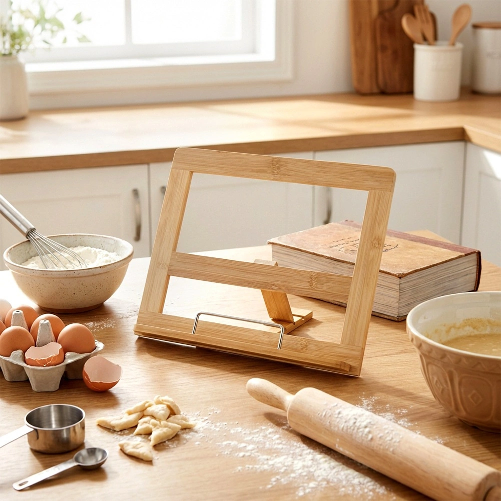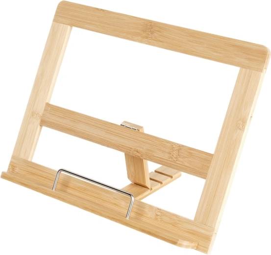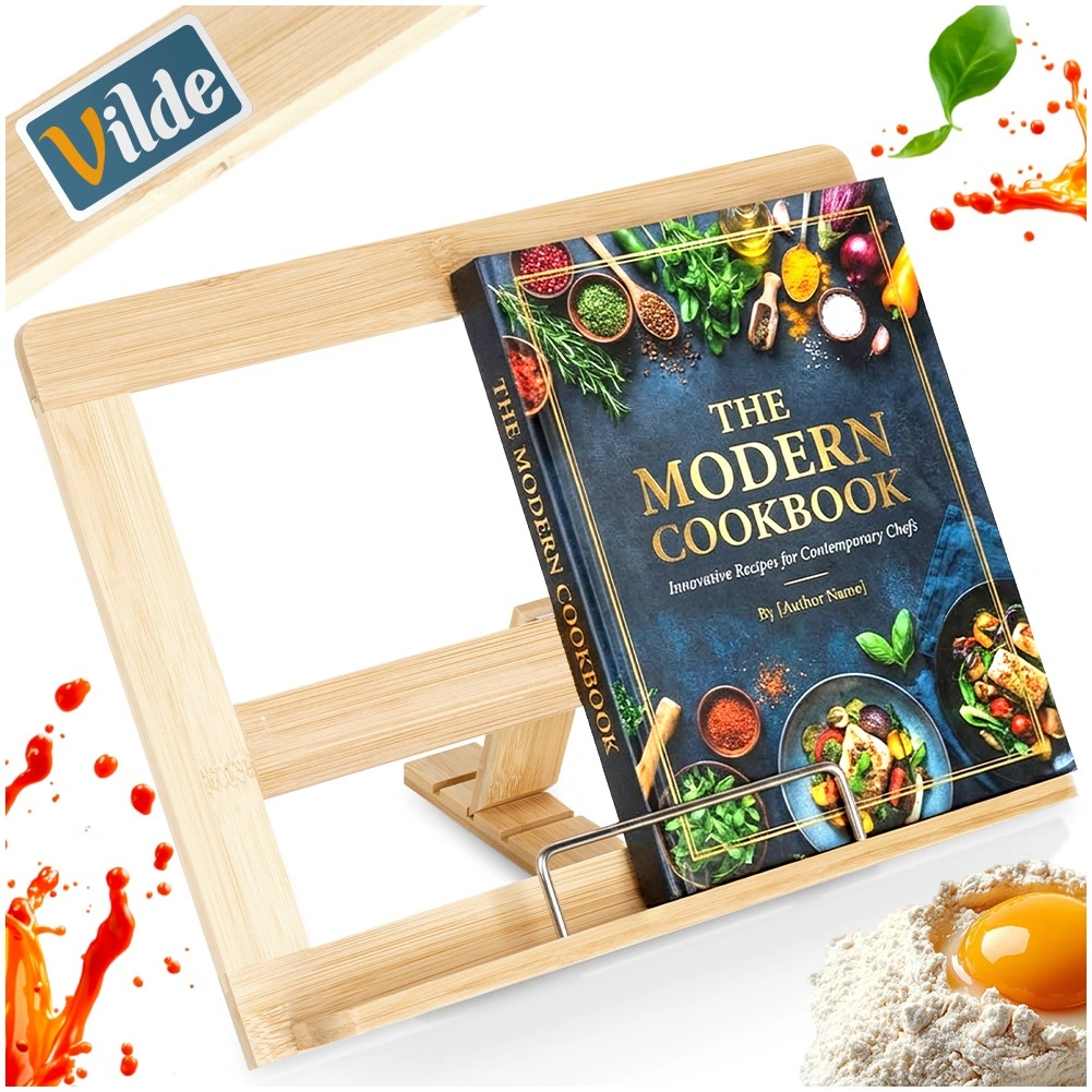 Praktische bamboe standaard voor kookboek en tablet houdt je handen vrij tijdens het koken en zorgt dat het recept altijd in het zicht blijft. De verstelbare helling in drie standen biedt comfortabel lezen, terwijl de stabiele constructie van natuurlijke bamboe bestand is tegen vocht en gemakkelijk te reinigen is. Ideaal voor boeken, kookboeken en tablets in elke keuken.