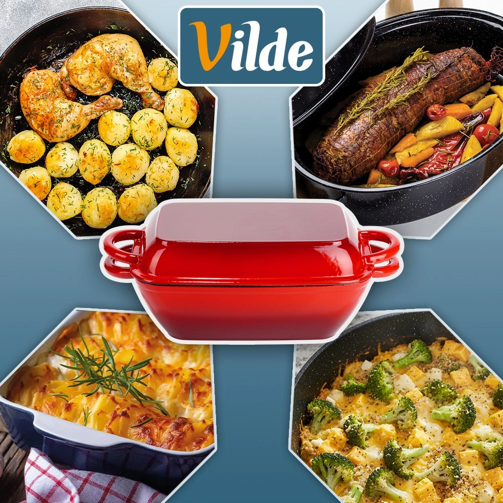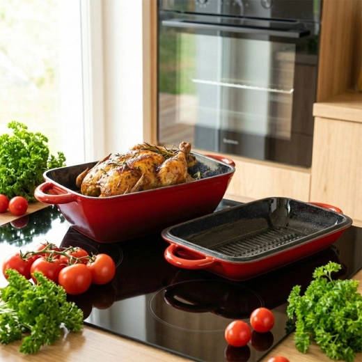 Universele gietijzeren braadslede-set 2-in-1 voor bakken, stoven en gratineren. Het deksel dient als een aparte grillpan met geribbelde bodem, terwijl de braadslede zelf gelijke warmteverdeling en langdurige warmteretentie biedt. Duurzame geëmailleerde afwerking, comfortabele zijgrepen en geschikt voor alle kookplaten inclusief inductie én voor in de oven.