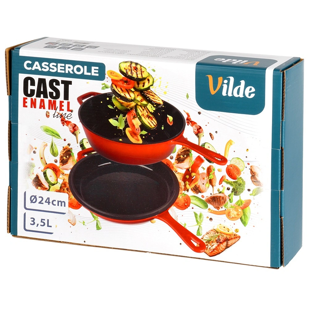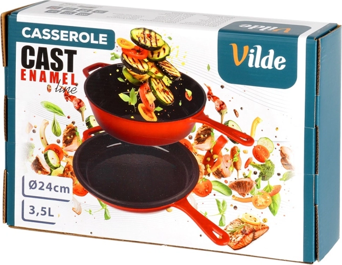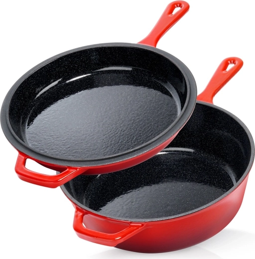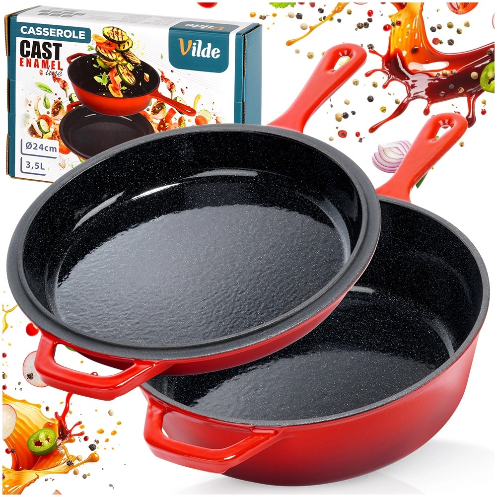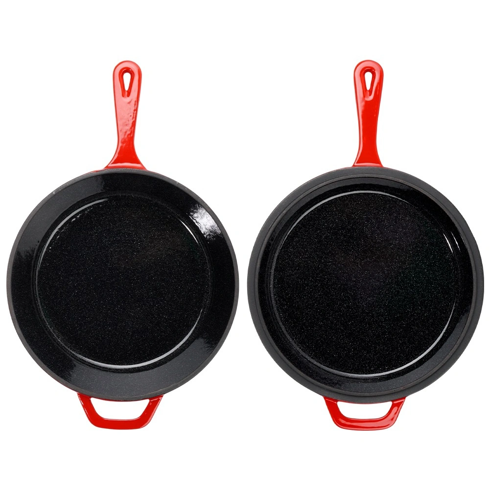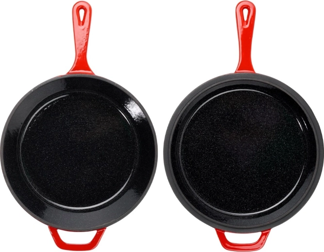 Robuuste gietijzeren set in het rood, bestaande uit een diepe pan/sauspan (3,5 l) en een koekenpan met een diameter van 24 cm. De zwarte binnenemaille is glad en eenvoudig te reinigen, aan de buitenkant beschermt glanzende rode emaille het kookgerei. Gietijzer geleidt en houdt warmte uitstekend vast, zodat je sappig vlees, knapperige aardappelen en aromatische groenten bereidt met minder energieverbruik.