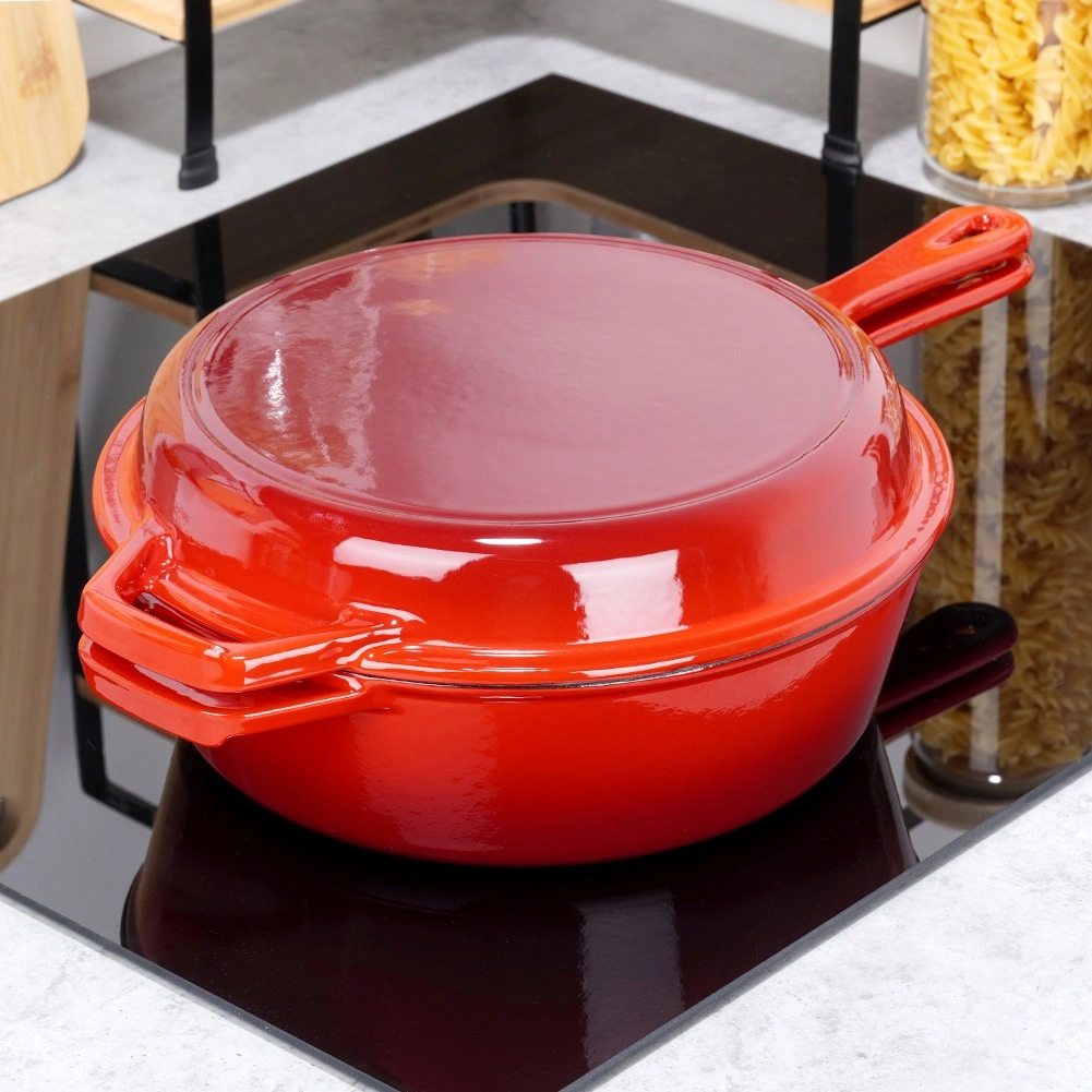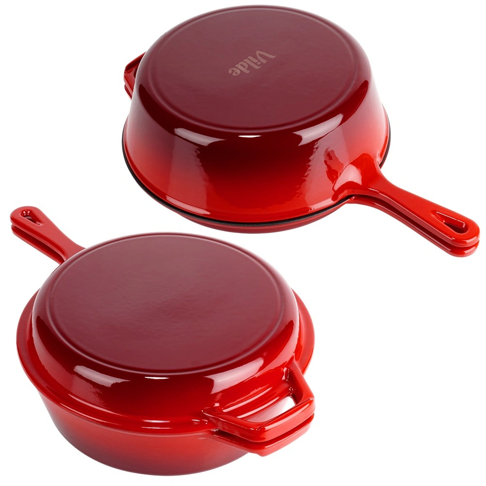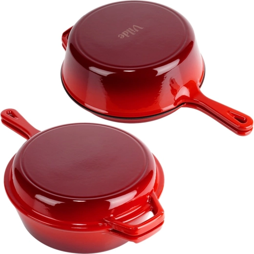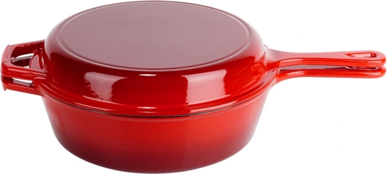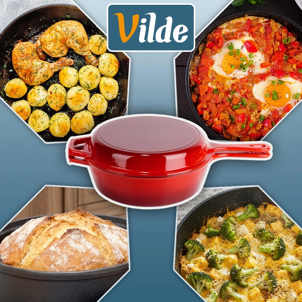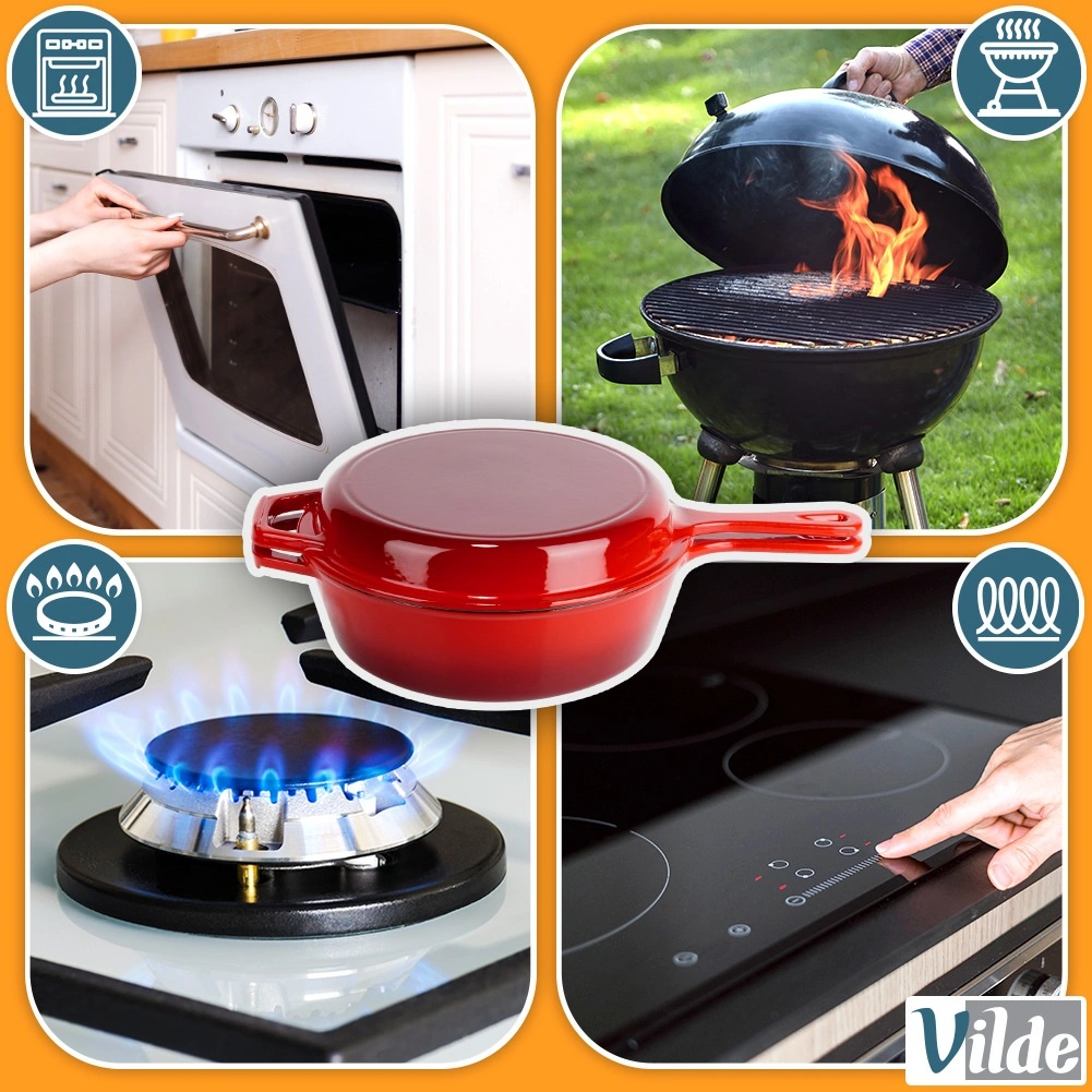 Praktische set van duurzaam gietijzer met een hoogwaardige geëmailleerde afwerking voor universeel koken op alle soorten fornuizen, inclusief inductie, en in de oven. Gelijke warmteverdeling, lange warmteopslag en antiaanbak-emaille zorgen voor perfect bakken, stoven en braden. De koekenpan kan dienen als deksel voor de pan, zodat je gemakkelijk goulash, ovengerechten of slowcooking bereidt, thuis of op de grill.