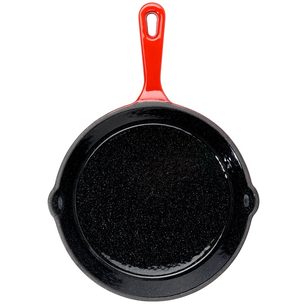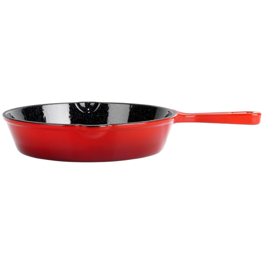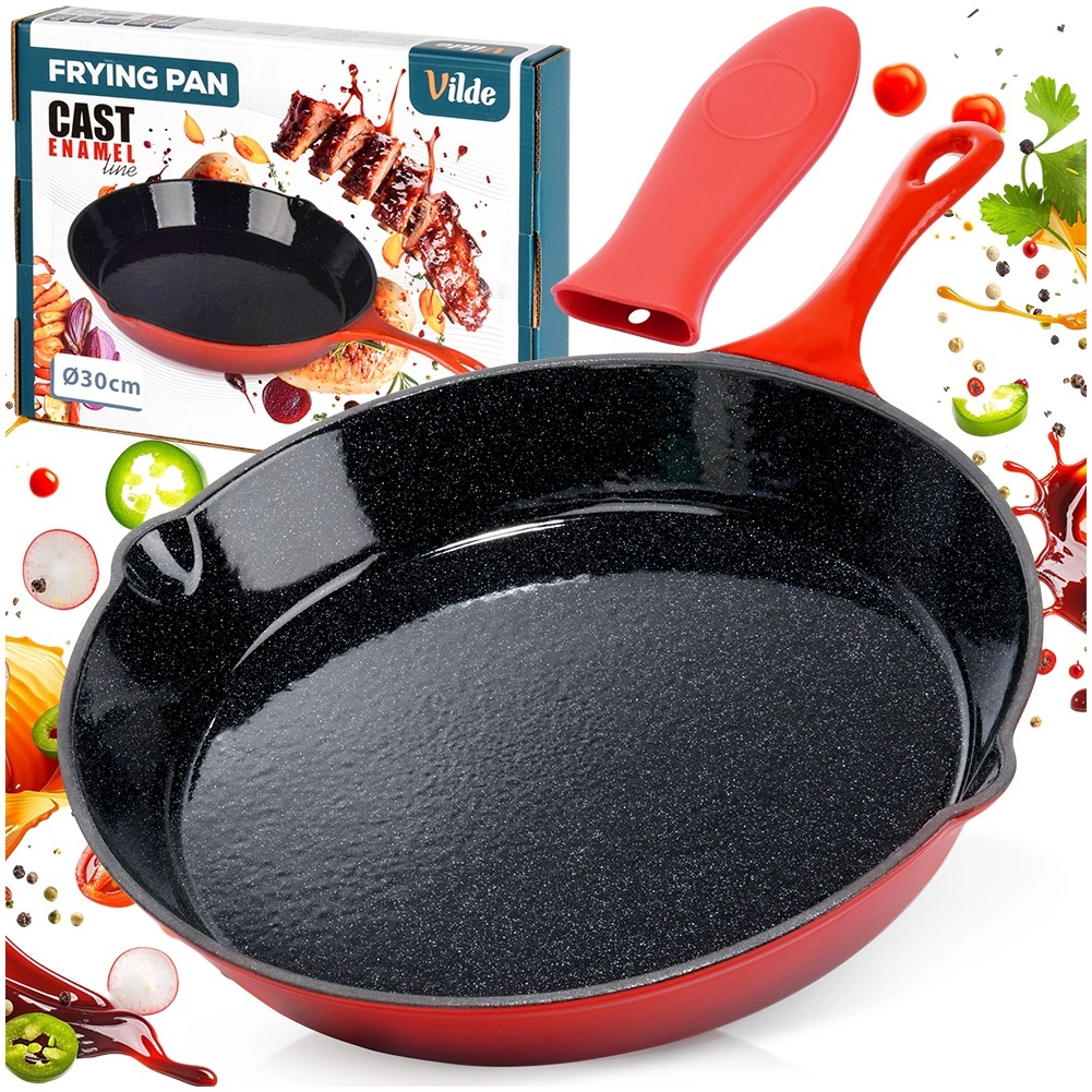 Universele gietijzeren pan met een diameter van 20 cm, met zwarte geëmailleerde binnenkant en rode emaillelaag aan de buitenkant. Biedt snelle en gelijkmatige verhitting, lange warmteopslag en twee praktische schenktuiten voor eenvoudig afgieten. Inclusief siliconen hoes voor de handgreep voor veilige hantering. Geschikt voor gas, elektriciteit, keramisch en inductie en voor in de oven.