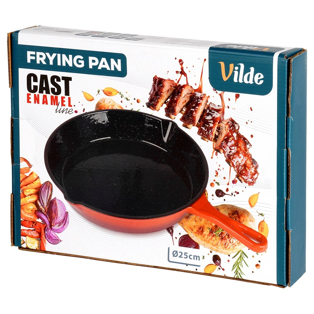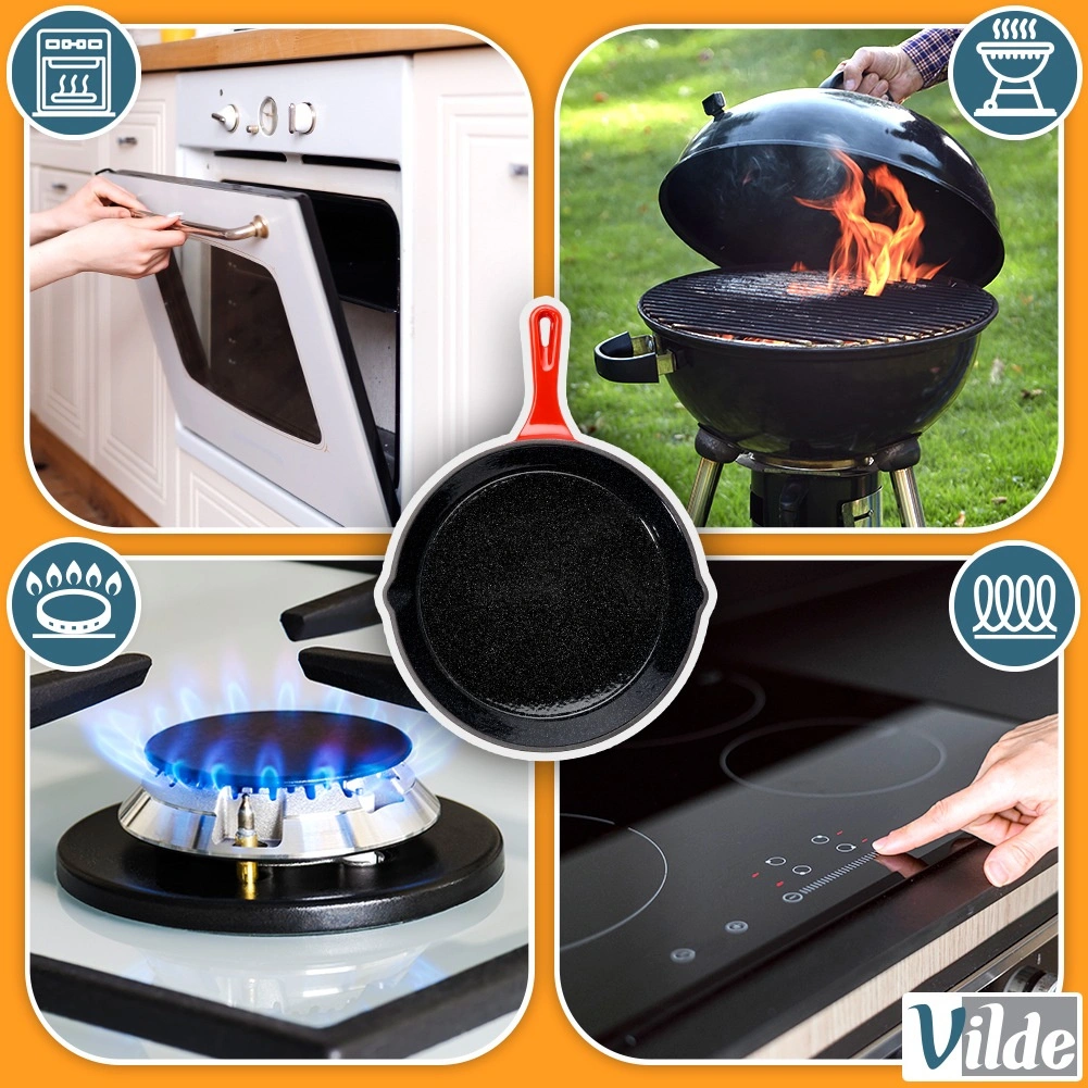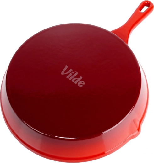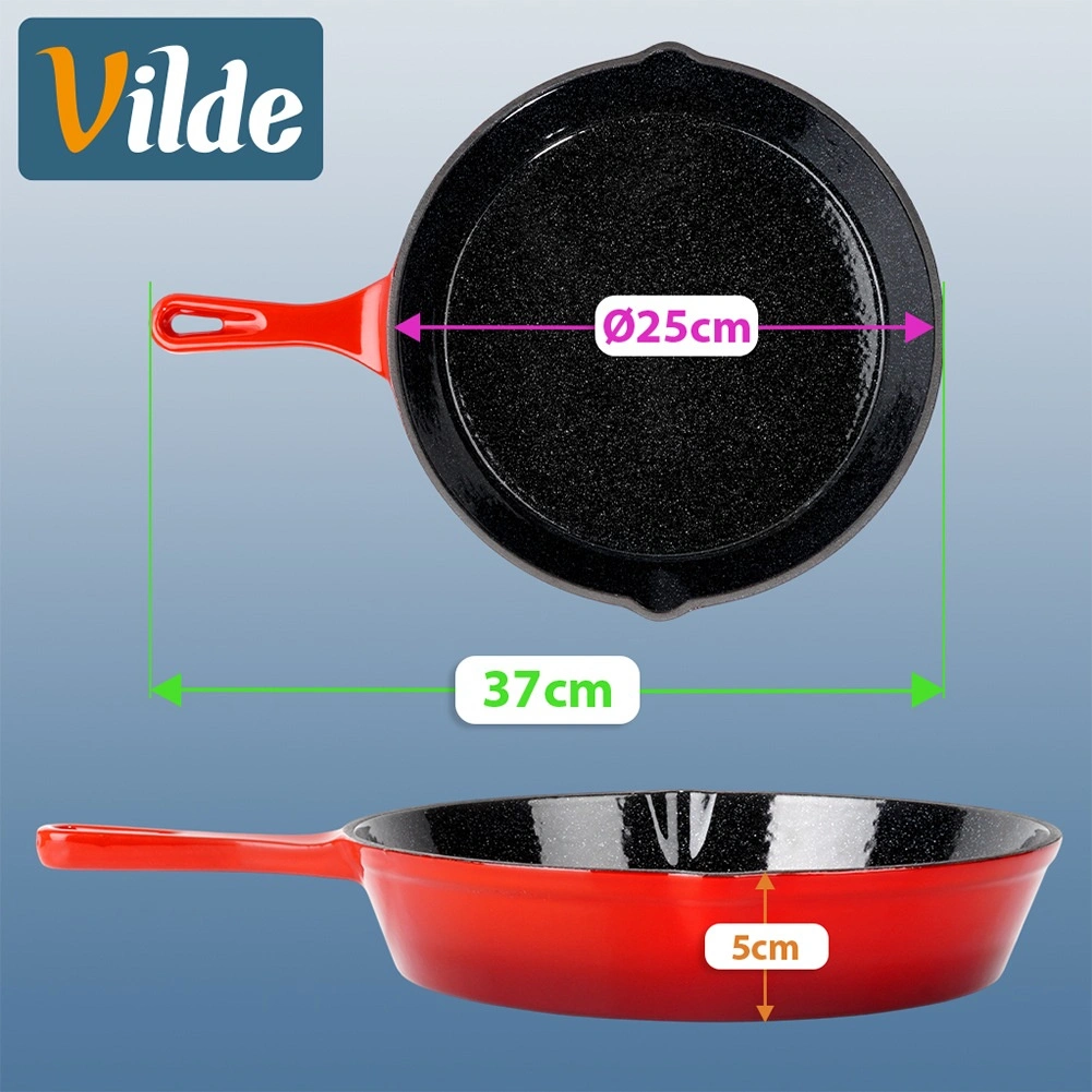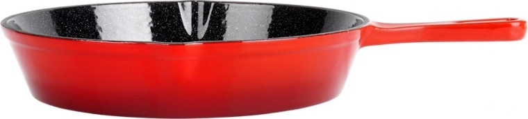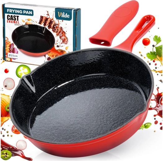 Robuuste gietijzeren pan met een diameter van 25 cm met een zwarte antiaanbaklaag van email aan de binnenkant en een rode buitenkant. Biedt gelijke warmteverdeling, lange warmtebehoud en is geschikt voor gas, elektrisch, keramisch en inductie, voor in de oven en op de grill. Inclusief een siliconen handgreephoes voor veilig dragen en twee schenktuiten voor eenvoudig serveren.
