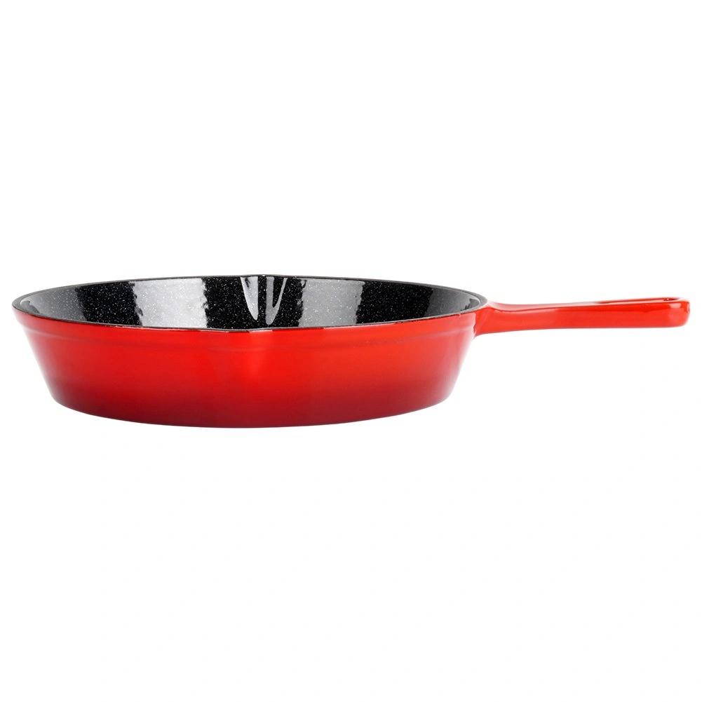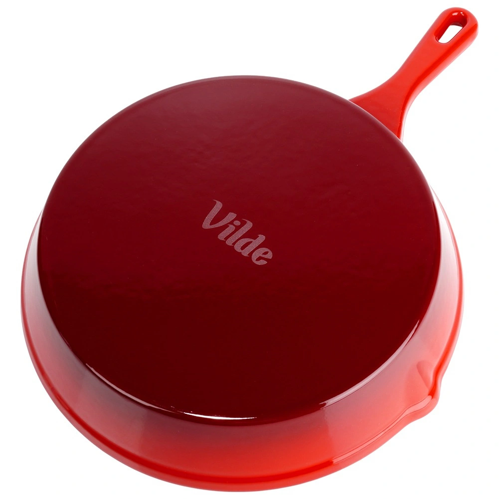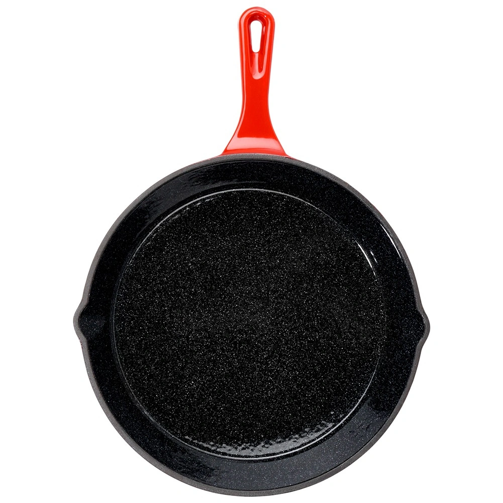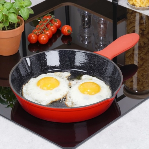 Robuuste gietijzeren pan met een diameter van 25 cm met een zwarte antiaanbaklaag van email aan de binnenkant en een rode buitenkant. Biedt gelijke warmteverdeling, lange warmtebehoud en is geschikt voor gas, elektrisch, keramisch en inductie, voor in de oven en op de grill. Inclusief een siliconen handgreephoes voor veilig dragen en twee schenktuiten voor eenvoudig serveren.