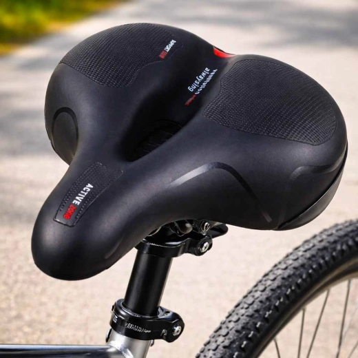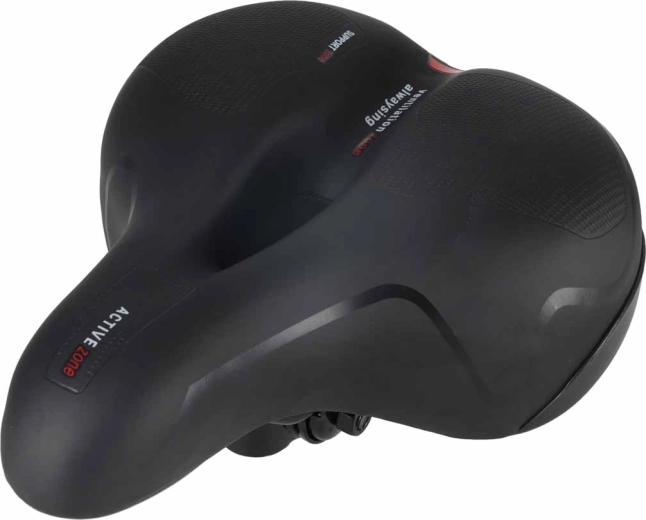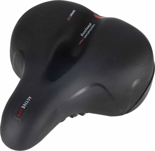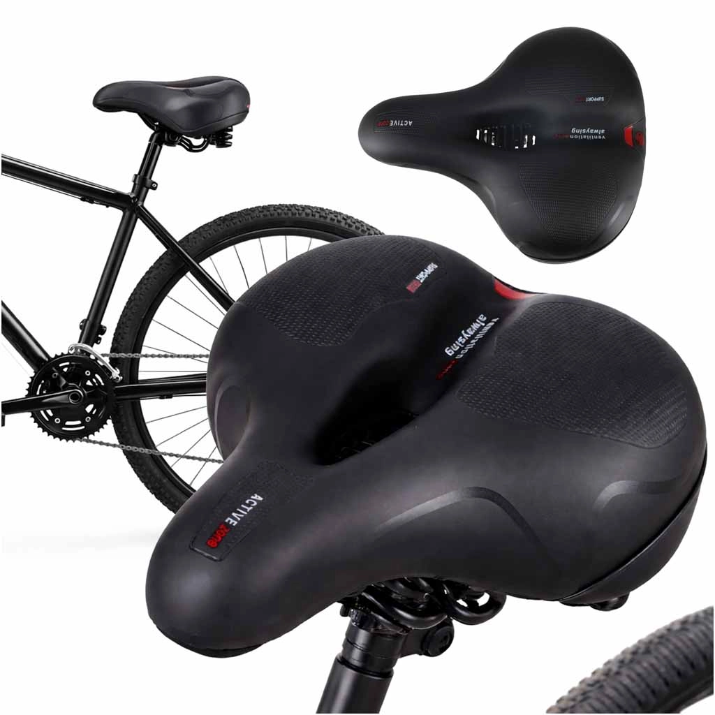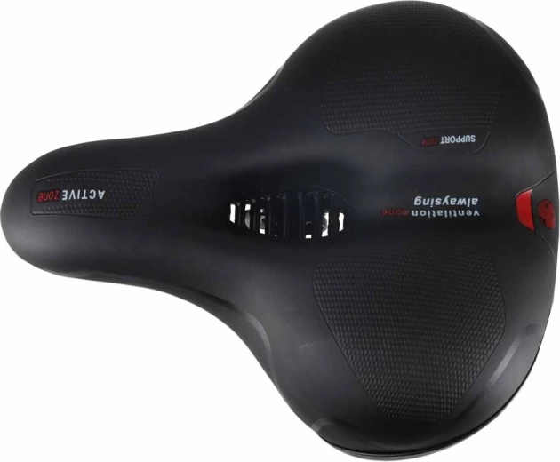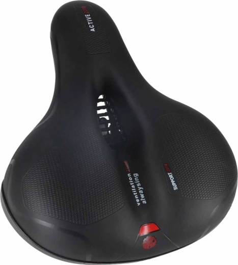 Comfortabel fietszadel voor stads- en trekkingritten met een brede ergonomische vorm, elastische schuimvulling en dubbele veer-absorptie voor een soepele rit zonder drukplekken. Dankzij het centrale ventilatiekanaal blijft het zadel luchtig, het waterdichte PU-leren oppervlak weerstaat regen en de geïntegreerde achterreflector verhoogt de zichtbaarheid na zonsondergang.