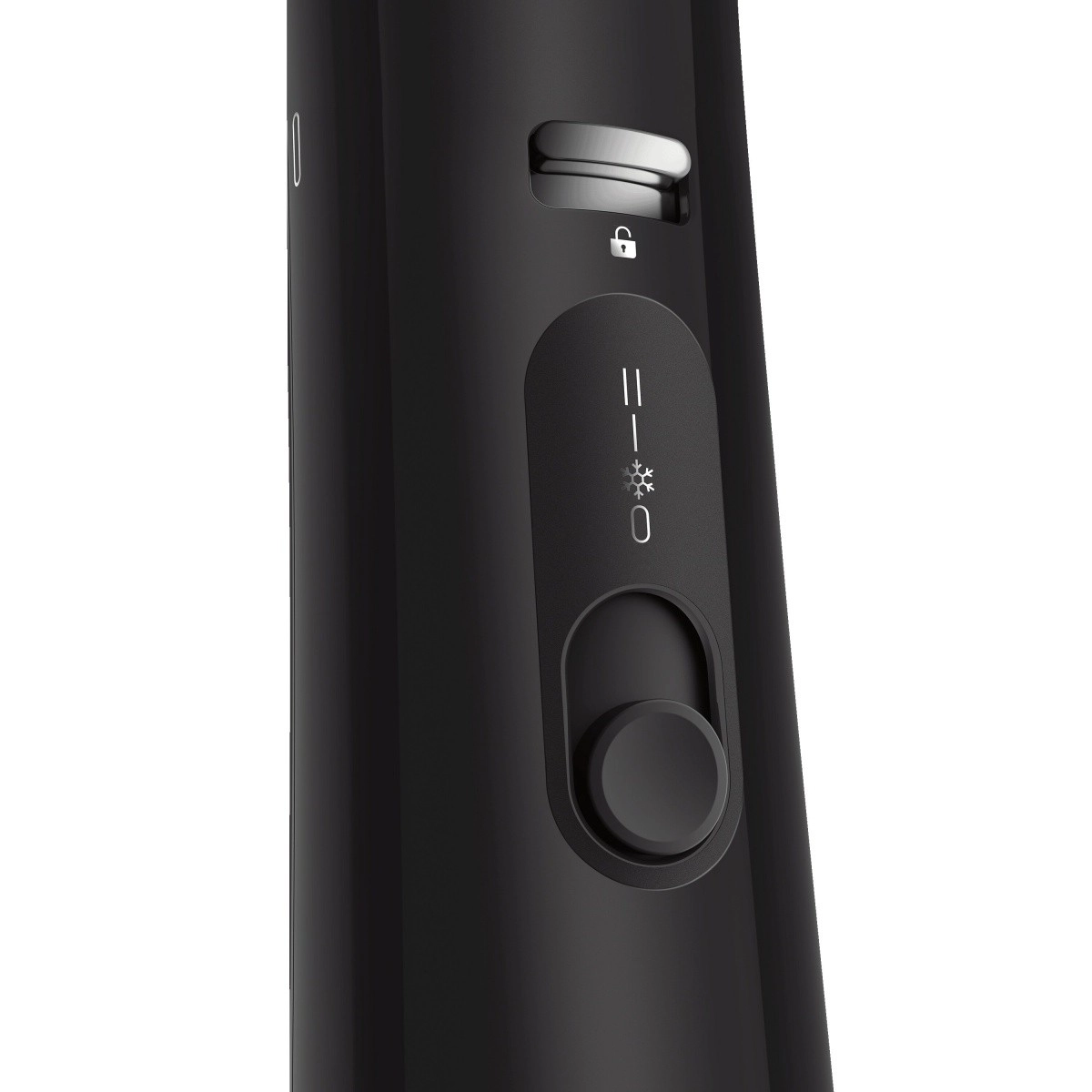 Schuifschakelaar en vergrendeling van de opzetborstel voor zekerheid tijdens gebruik. De bedieningselementen zijn goed bereikbaar en gemakkelijk af te lezen.