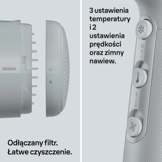 De bediening is intuïtief: meerdere niveaus van temperatuur en snelheid laten je het drogen afstemmen op je haartype. De koude-luchtfunctie sluit de haarschubben en verlengt de houdbaarheid van je kapsel. Het afneembare achterfilter maakt reinigen eenvoudig en verlengt de levensduur van het apparaat.