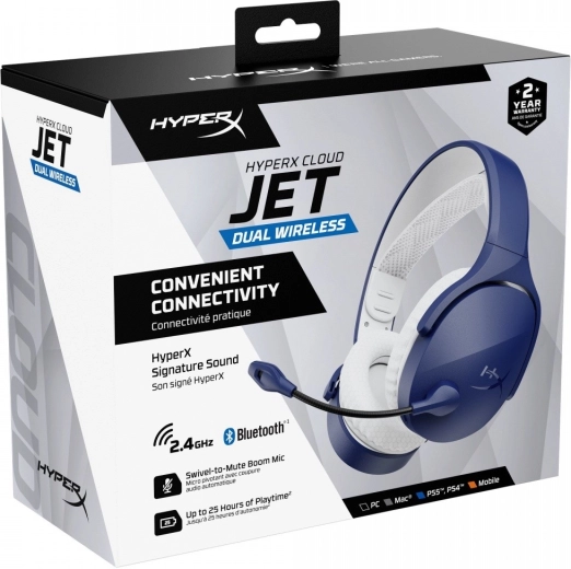 De draadloze gamingheadset HyperX Cloud Jet combineert dual‑wireless 2,4 GHz en Bluetooth 5.3, rijk geluid van 40 mm drivers en tot 25 uur batterijduur. Dankzij de opklap‑om‑te‑dempen microfoon, het lichte ontwerp en ademende oorkussens geniet je van comfortabel en soepel gamen op pc, consoles en mobiele apparaten.