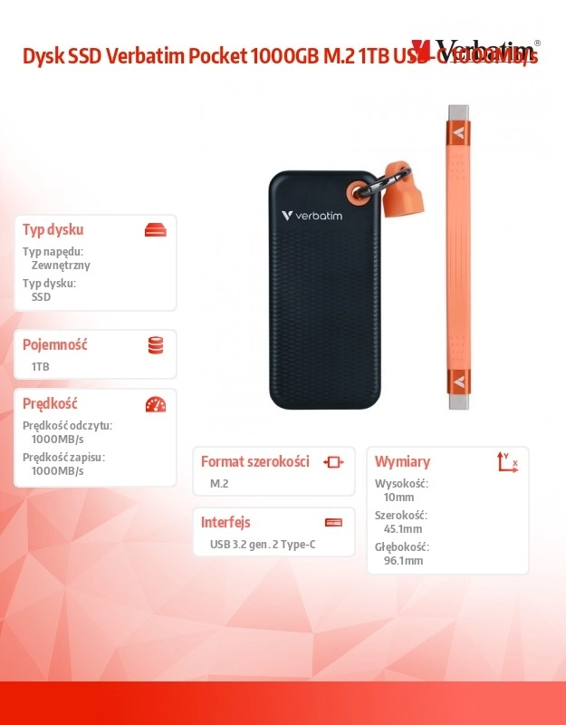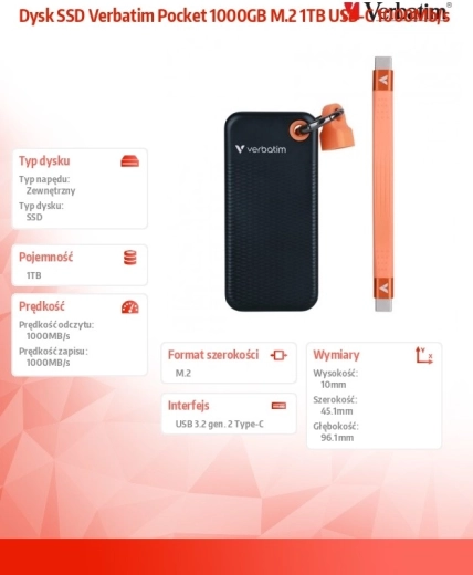 De externe SSD VERBATIM Pocket is de ideale keuze voor snel en veilig gegevensoverdracht onderweg en op kantoor. Dankzij de USB 3.2 Gen 2-interface bereikt hij lees- en schrijfsnelheden tot 1000 MB/s, wat ideaal is voor werken met grote bestanden, het bewerken van video in hoge resolutie en het starten van veeleisende applicaties.