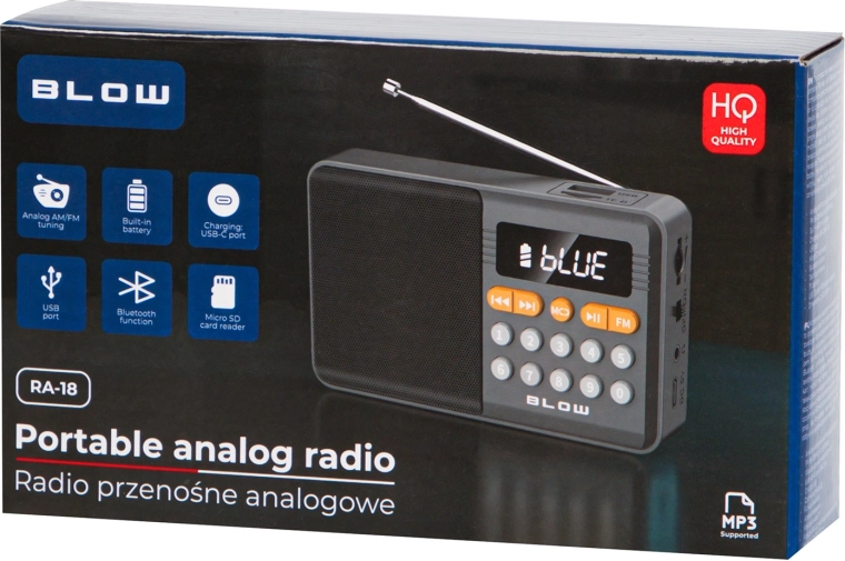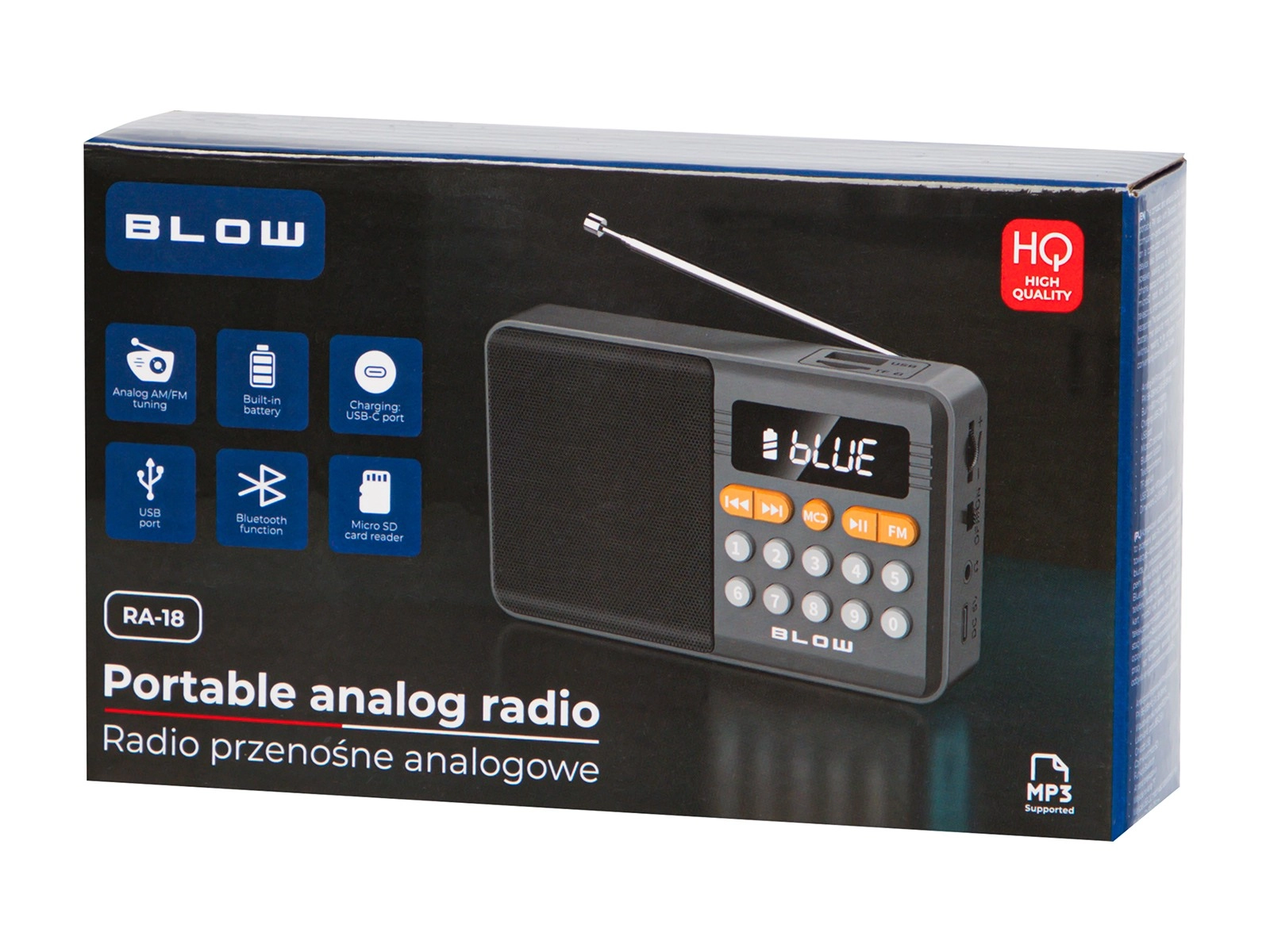 De BLOW RA18 is een praktische draagbare radio die analoge AM/FM‑ontvangst combineert met moderne connectiviteit. Als draadloze Bluetooth‑speaker speelt hij muziek af vanaf je telefoon, laptop of tablet, en ondersteunt hij MP3 vanaf microSD-kaarten en USB-sticks. Dankzij de compacte afmetingen, polslus en overzichtelijke bediening is hij ideaal voor onderweg, op kantoor en op de bouwplaats.