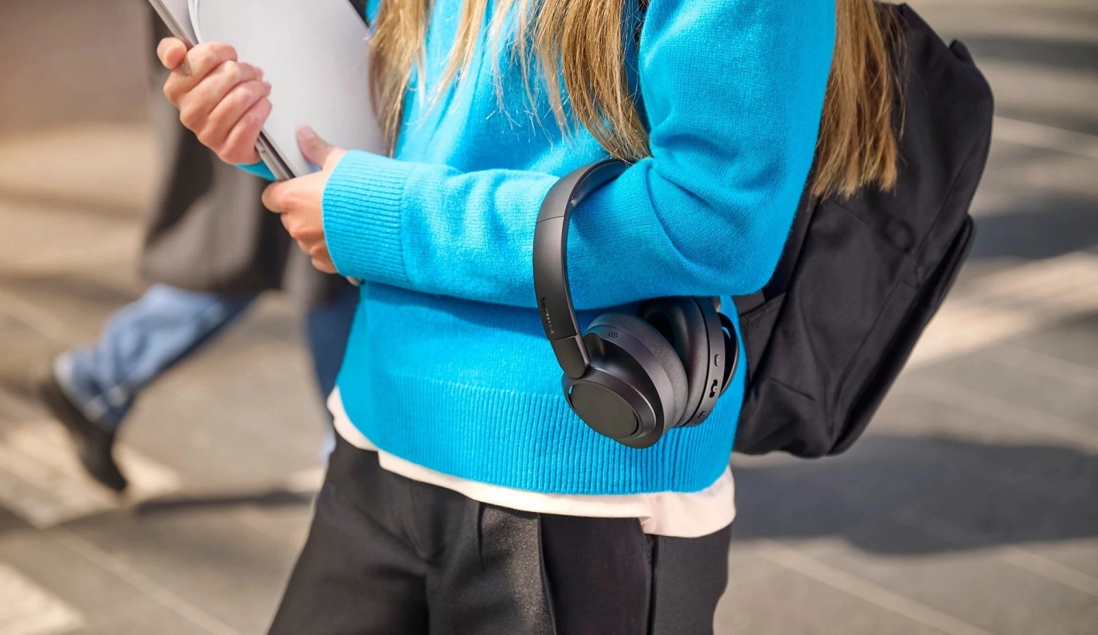 Oorkussens van traagschuim en een verstelbare hoofdband zorgen de hele dag voor comfort. De oorschelpen vouwen plat en naar binnen – ideaal voor in een rugzak of reistas.