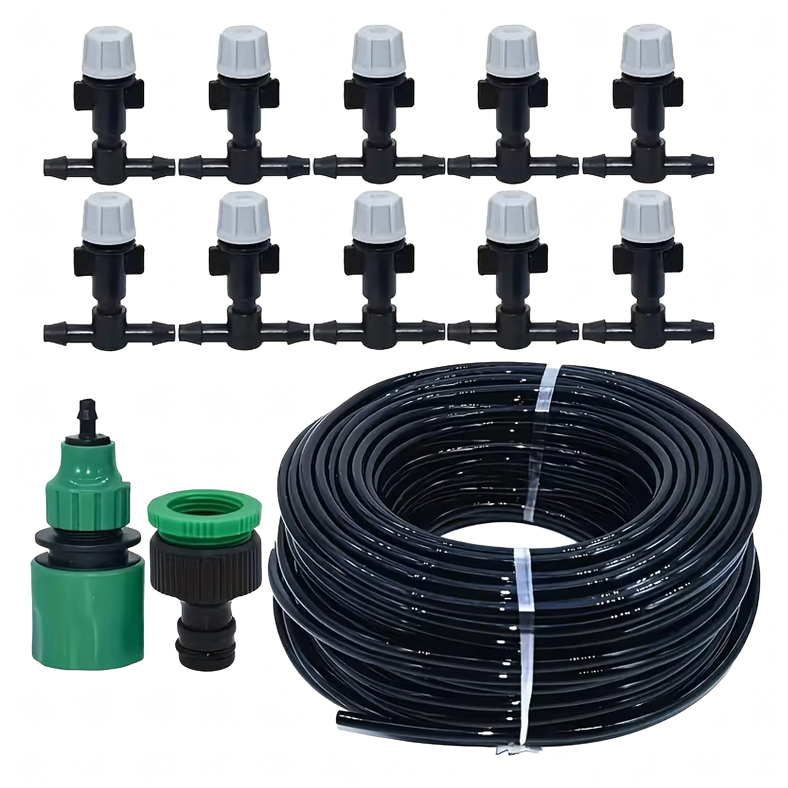 Dit veelzijdige tuin-nevelsysteem zorgt voor zachte en gelijkmatige bewatering direct bij de wortels én op het blad. Dankzij de verstelbare sproeikoppen creëert u een fijne verkoelende nevel voor terrassen en kassen of een gerichte micro-sproei voor kweekbedden en bakken. Het systeem verzekert een stabiele waterverdeling naar meerdere punten en is eenvoudig uit te breiden met T-connectoren.