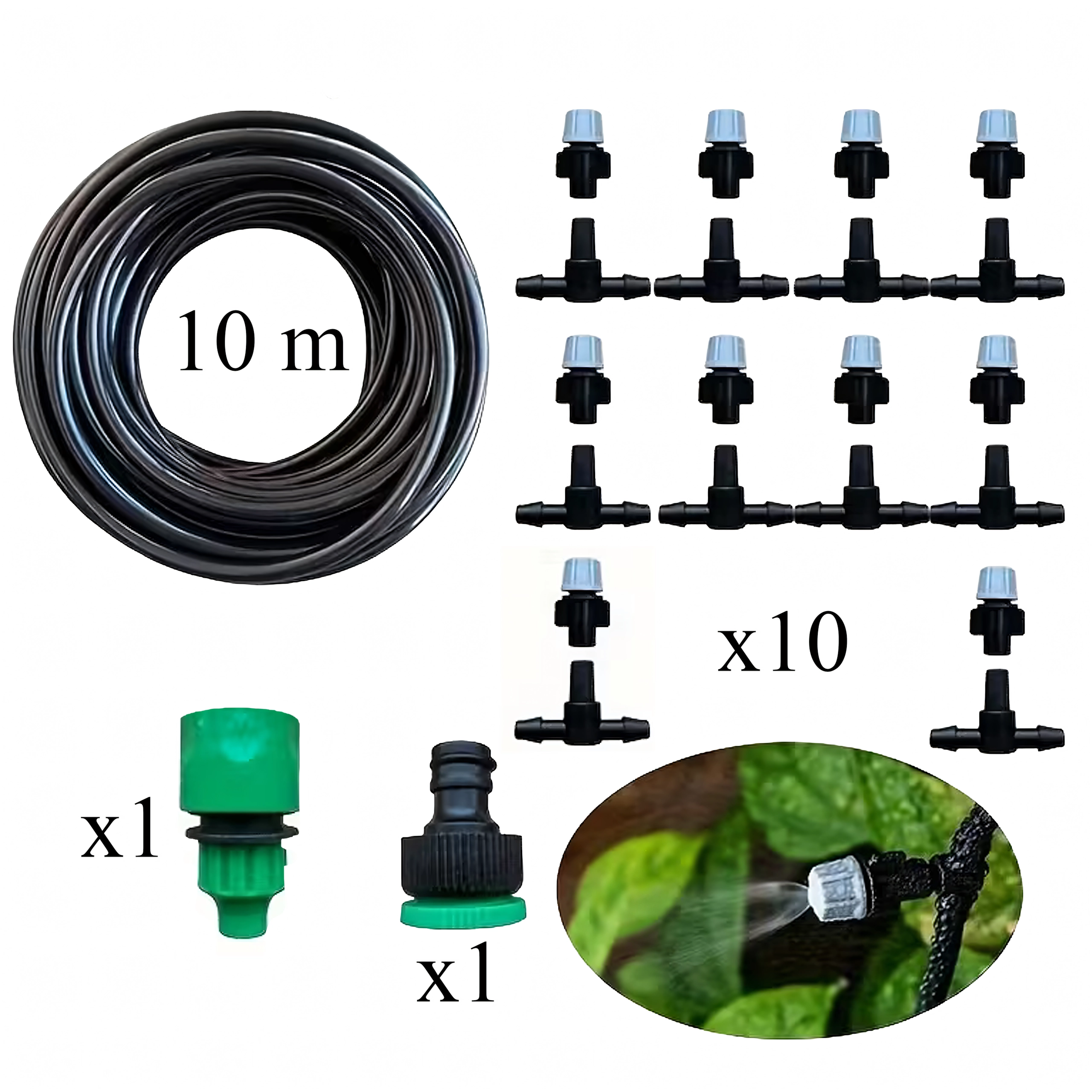 Complete set voor nevel- en druppelirrigatie met een lengte van 10 m en 10 verstelbare sproeiers voor efficiënte bewatering van borders, kassen en bloembakken. Biedt een fijne nevel voor verkoeling en gelijkmatige bewatering zonder waterverspilling. Eenvoudige installatie, waterbesparing en de mogelijkheid om de richting en intensiteit van de sproei aan te passen.