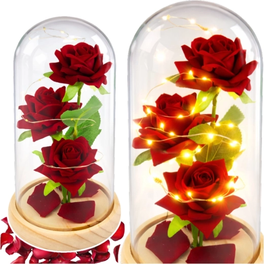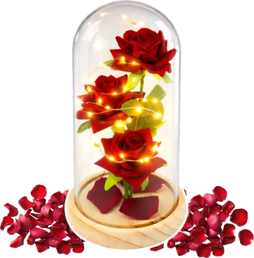 Elegante decoratie met eeuwige rode rozen onder een transparante glazen koepel en warm LED-licht die een romantische sfeer in elk interieur creëert. Zonder onderhoud behoudt het langdurig een perfect uiterlijk en is het ideaal als stijlvol cadeau en designaccessoire voor woonkamer, slaapkamer of kantoor.