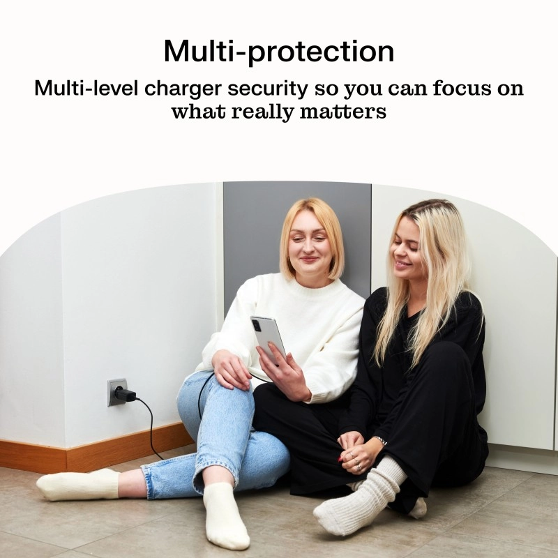 De ingebouwde intelligente laadregeling past het vermogen automatisch aan het aangesloten apparaat aan voor maximale snelheid, veiligheid en een lage bedrijfstemperatuur. Meerlaagse bescherming beveiligt tegen overspanning, overbelasting en oververhitting, zodat je de lader gerust onbeheerd kunt laten.