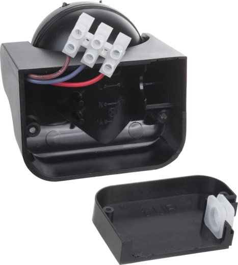 De sensor detecteert beweging in een hoek van 180° en tot een afstand van 12 meter, waardoor ingangen, gangen en opritzones betrouwbaar worden gedekt.