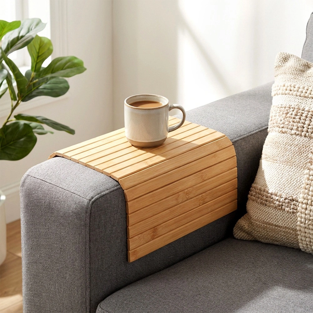 De lamellen passen zich aan de vorm van de armleuning aan en creëren een vlak oppervlak voor een mok, glas of kleine spullen – een praktische oplossing zonder bijzettafel.