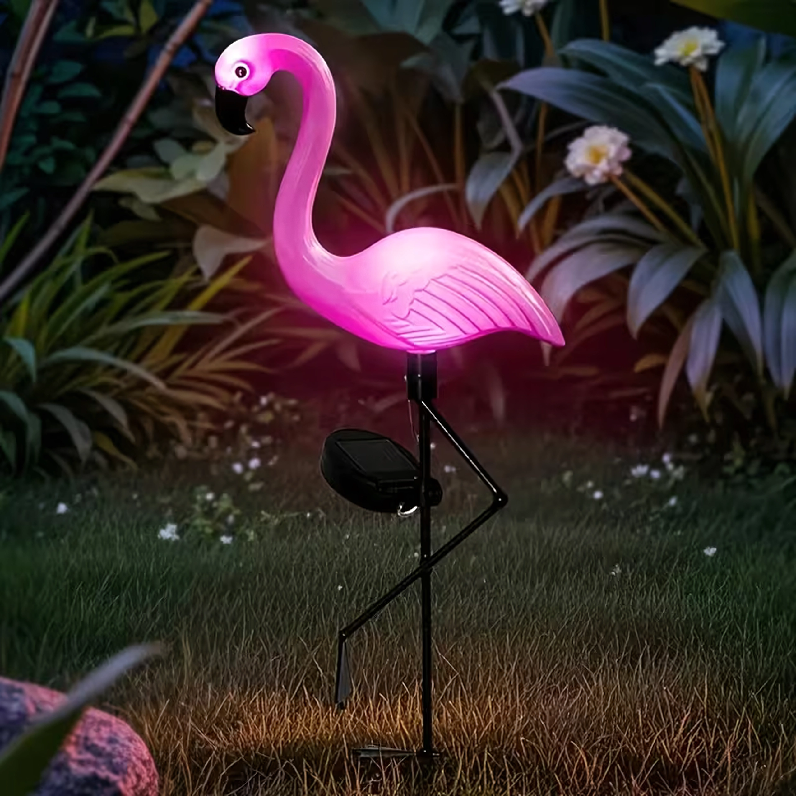 Deze zonne-tuinlamp in flamingo-ontwerp geeft je buitenruimte een speels accent en een sfeervolle ambiance. Overdag laadt hij op in de zon en na zonsondergang gaat hij automatisch aan met een indrukwekkende roze gloed. Perfect om paadjes te accentueren, rond een vijver of als blikvanger op tuinfeestjes.