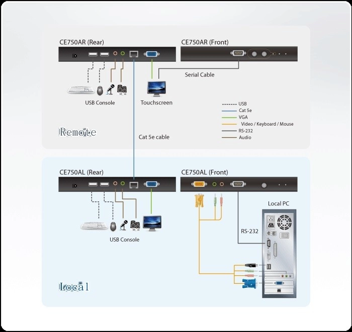 De geïntegreerde RS‑232-poort op zowel de lokale als de remote unit maakt seriële configuratie en aansluiting mogelijk van apparaten zoals touchscreens of barcodescanners. Deze oplossing is ideaal voor industriële omgevingen, productiehallen of bouwplaatsen, waar u de console binnen handbereik wilt hebben en de computer in een beschermde ruimte.