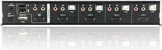 Professionele KVM-switch voor 4 computers met HDMI en USB 2.0 waarmee u alles vanaf één console kunt bedienen. Biedt onafhankelijk schakelen van video, USB-randapparatuur en audio, ondersteuning voor Full HD 1080p / 1920 × 1200, HDCP-technologie en premium geluid Dolby TrueHD / DTS‑HD Master Audio. Dankzij de ingebouwde 2-poorts USB 2.0-hub sluit u eenvoudig toetsenbord, muis en andere apparaten aan.