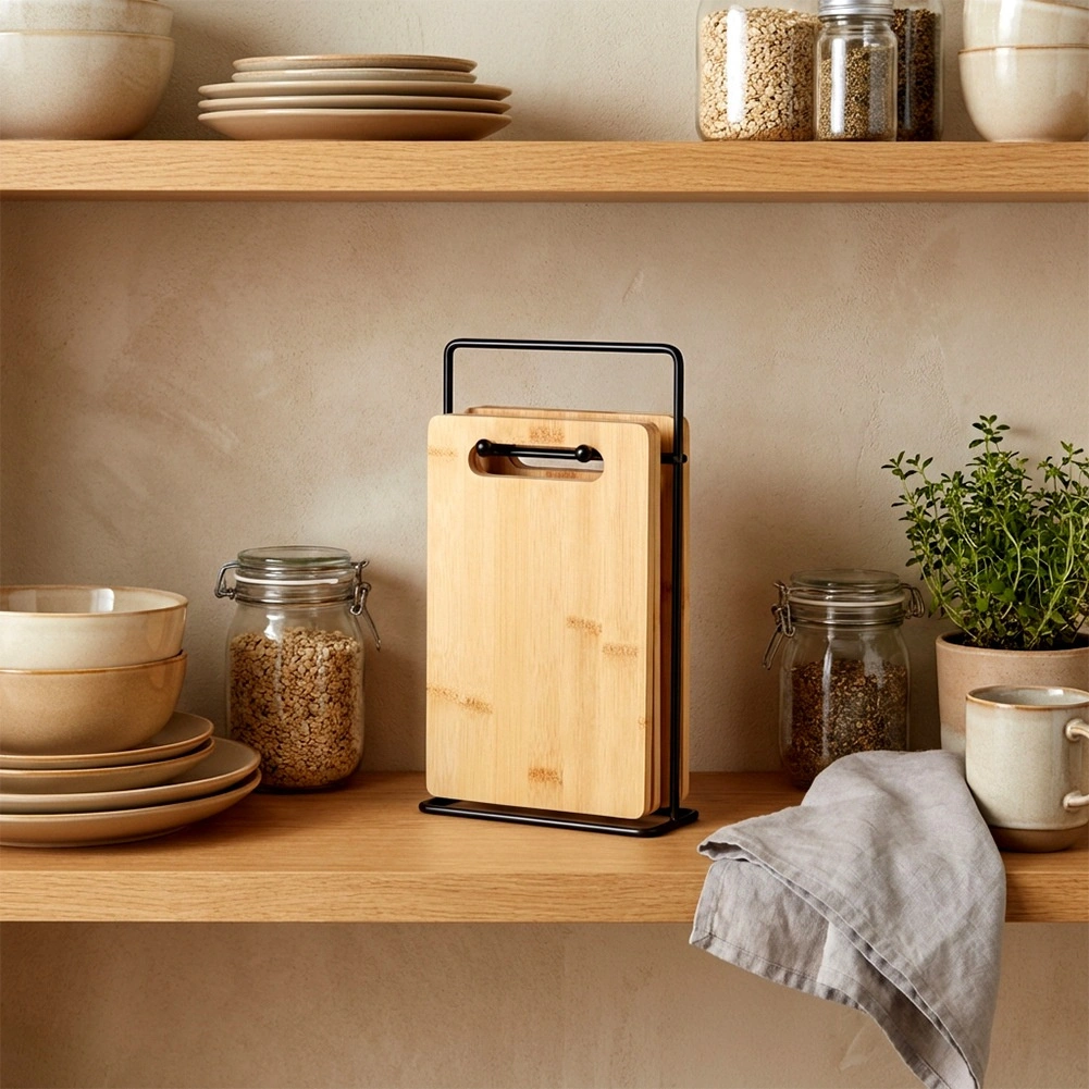 Praktische set van vier bamboe snijplanken met een stabiele metalen houder bespaart ruimte en houdt de keuken netjes. Elke plank meet 22 × 14 cm met een dikte van 0,7 cm. Bamboe is van nature vochtbestendig, droogt snel en neemt geen geuren op. De metalen houder in het zwart is stevig en stabiel en zorgt voor een overzichtelijke opslag van de planken voor dagelijks koken.