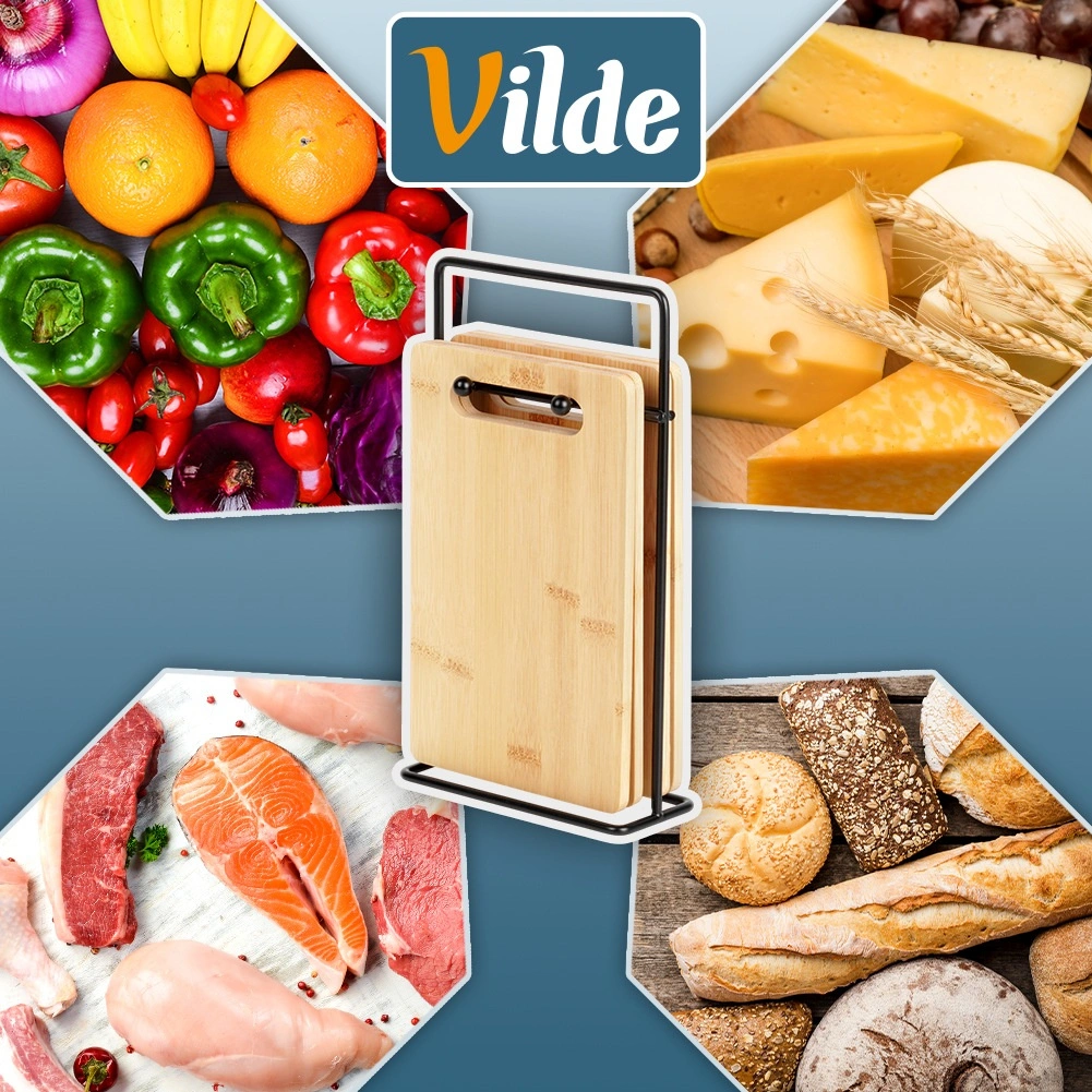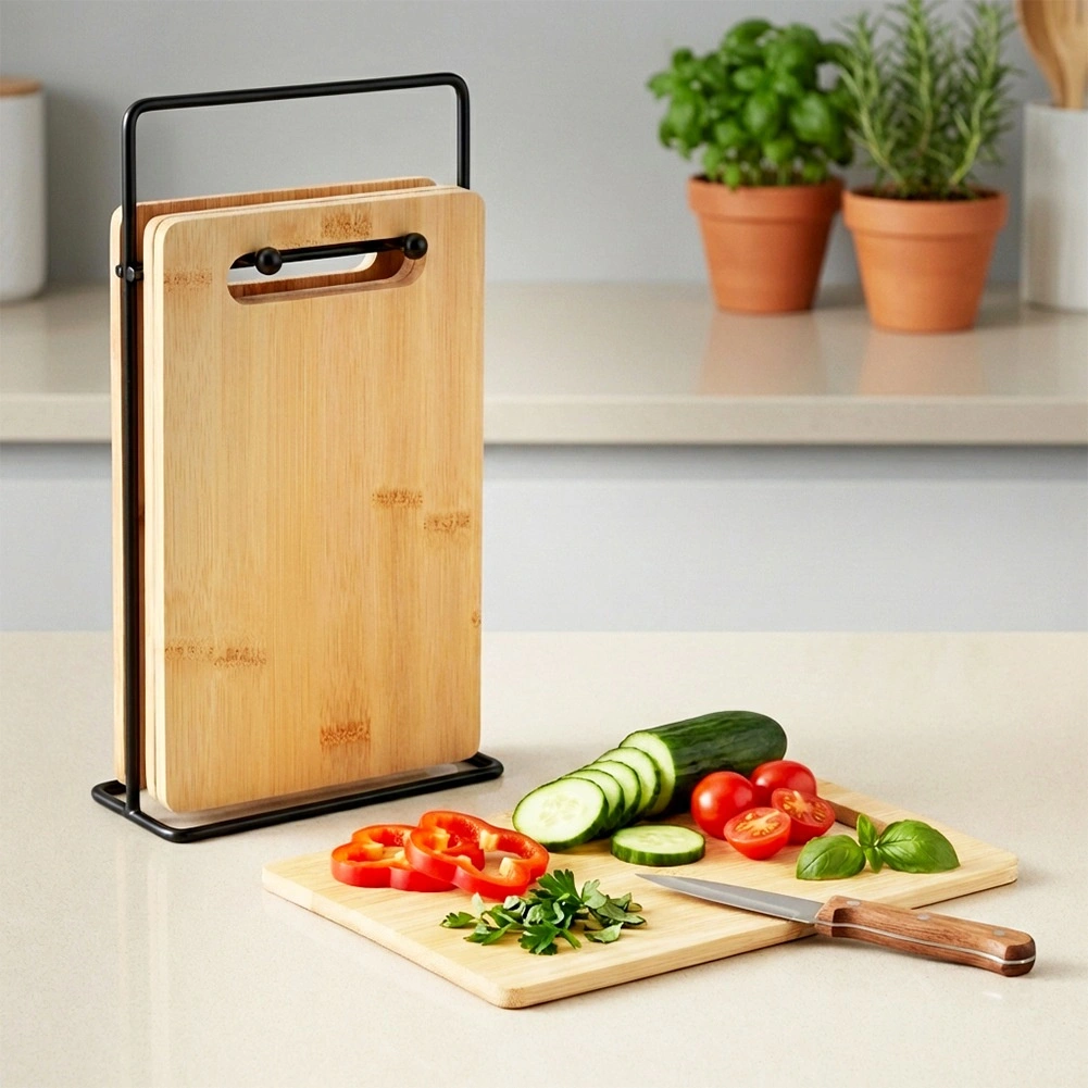4 × bamboe snijplank, 1 × metalen houder