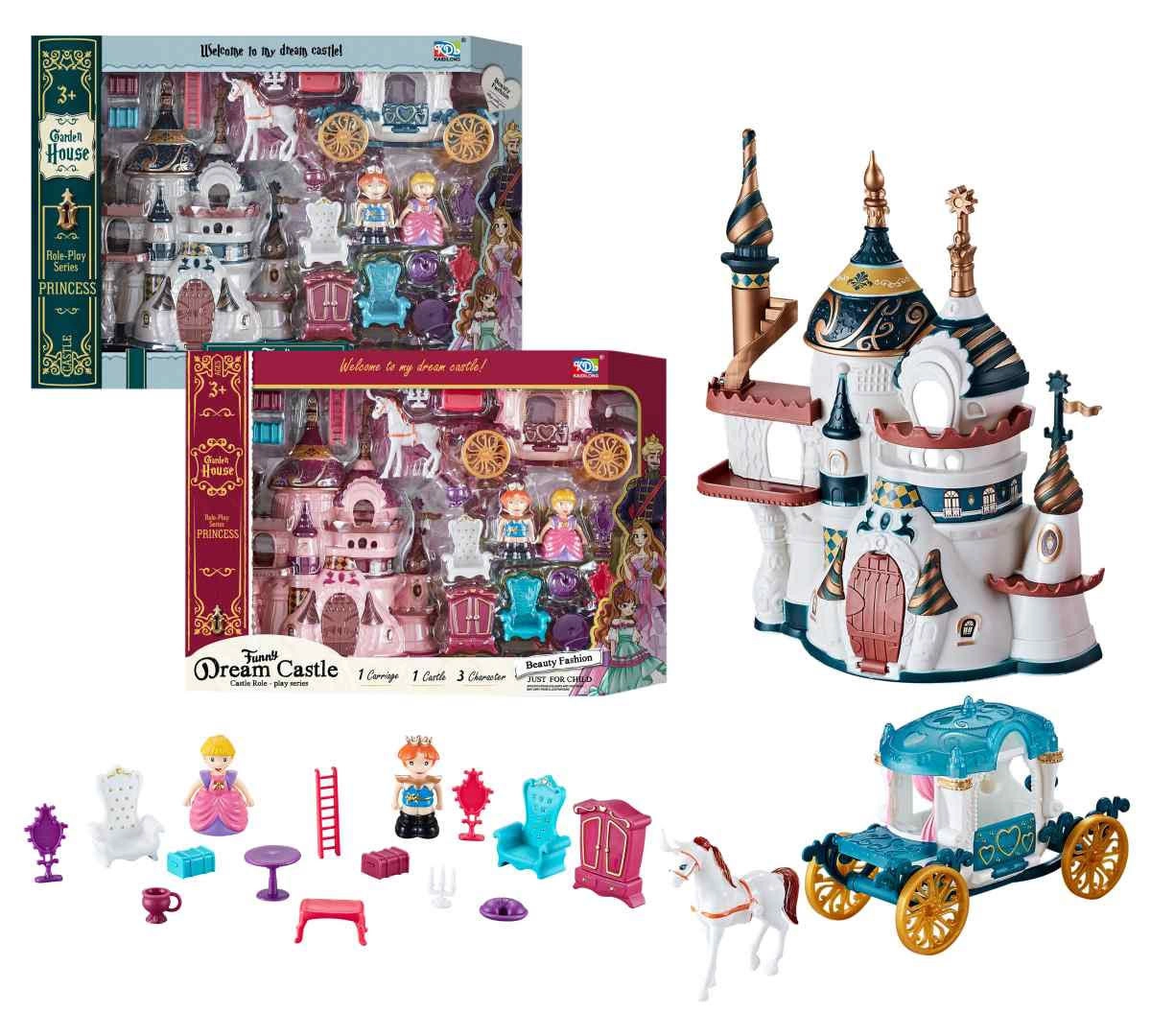 In de verpakking vind je een kasteel, koets, twee figuurtjes en meubels. Het product is verkrijgbaar in twee kleuren, zodat je kunt kiezen wat het kind het leukst vindt. Dankzij de afmetingen van 18,5 × 21,5 cm is het perfect voor spelen thuis én onderweg.