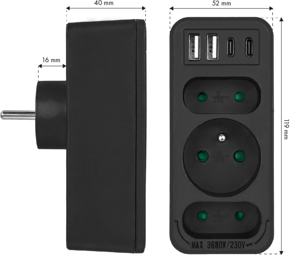 De geïntegreerde poorten 2× USB-A (max. 3 A / 18 W) en 2× USB-C met Power Delivery (max. 20 W) zorgen voor snel en stabiel opladen van moderne smartphones, tablets, powerbanks en draagbare consoles – zonder extra laders. De verdeler is daarmee ideaal voor de woonkamer, werkkamer en studentenkamer.