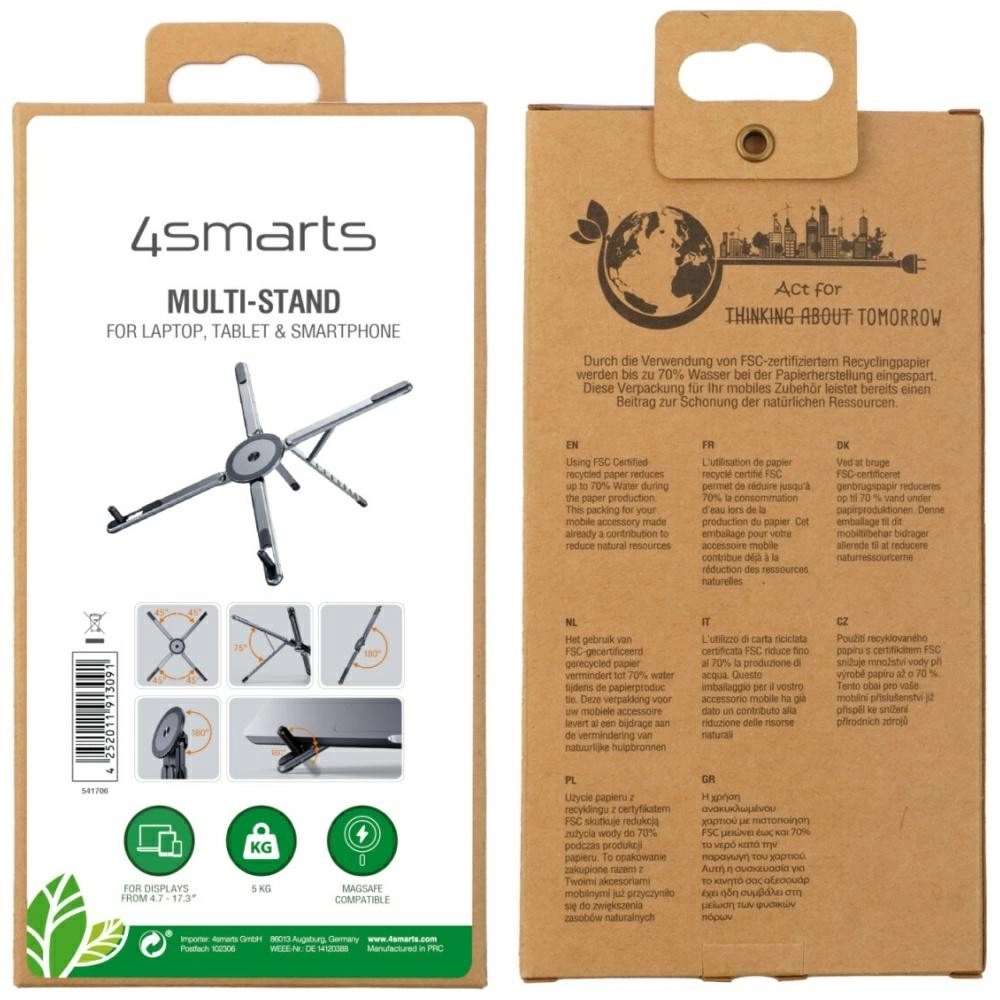 De multifunctionele 4smarts-standaard in een elegante grijze kleur verbetert de ergonomie bij het werken met laptop, tablet en smartphone. Dankzij de aluminium constructie, de verstelbare hoek en de sterke MagSafe-magneet voor iPhone biedt hij een stabiele ondersteuning, betere koeling van apparaten en comfortabel video’s kijken en videobellen thuis en onderweg.