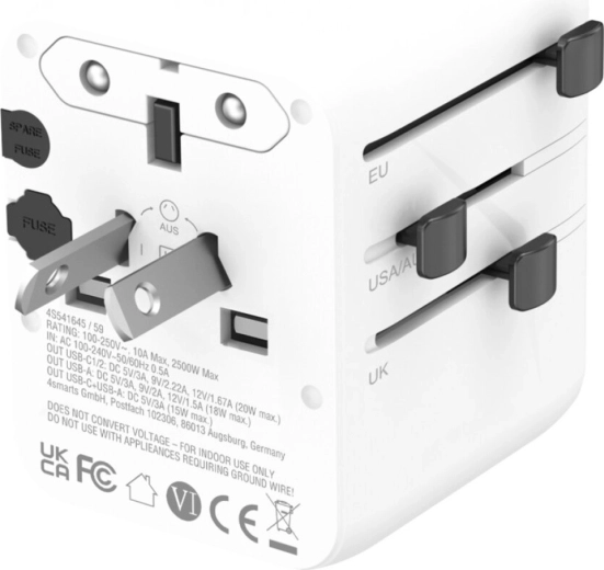 De praktische interfaces omvatten 2x USB‑C en 1x USB‑A voor gelijktijdig laden van telefoon, tablet of powerbank. Het universele AC‑stopcontact met een vermogen tot 2500 W (10 A) maakt ook het aansluiten van veeleisendere apparaten mogelijk. Uitschuifbare stekkersets voor EU, UK, VS/AUS en compatibiliteit met meer dan 200 landen garanderen probleemloos gebruik wereldwijd.