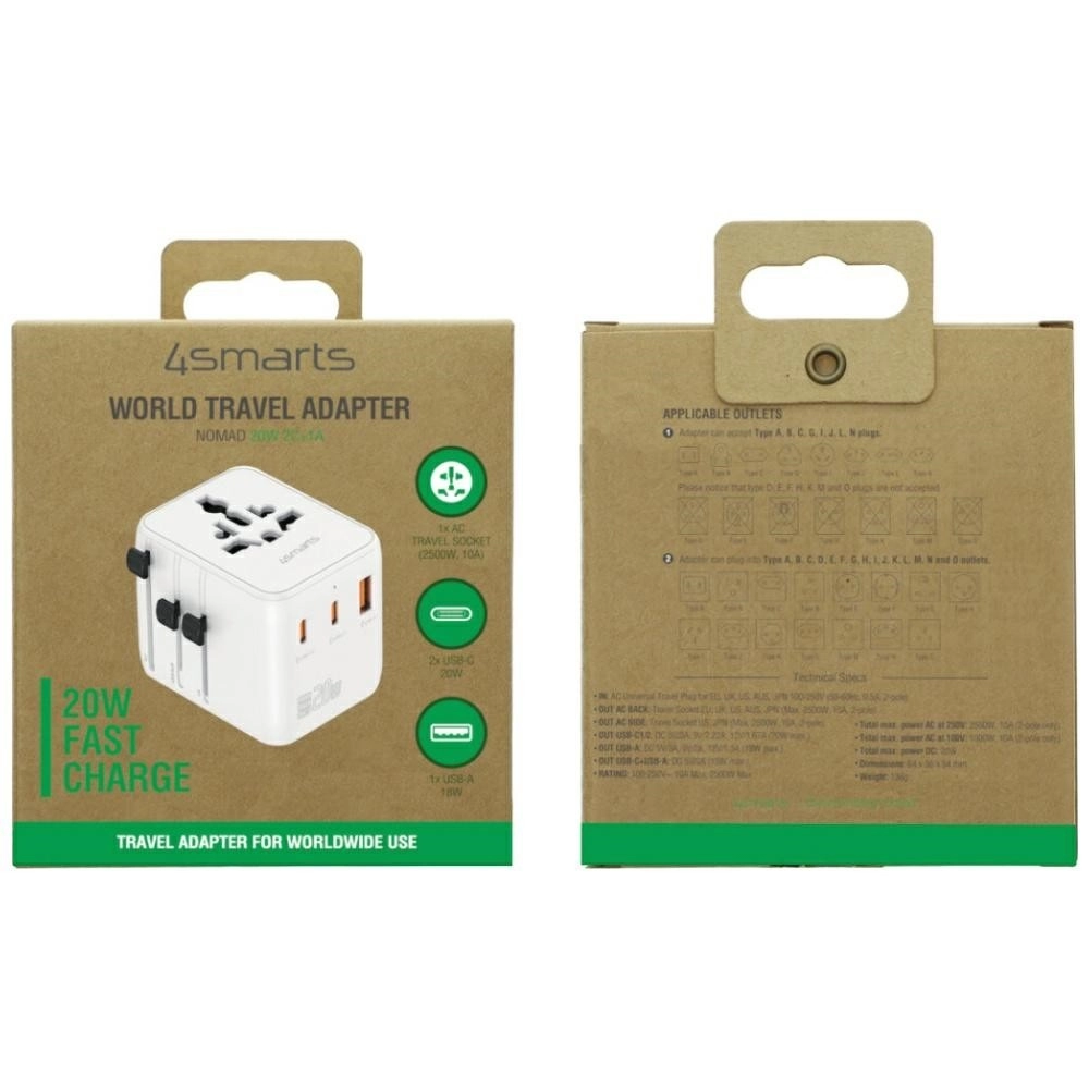De 4smarts NOMAD 20W is de ideale metgezel voor zaken- en privéreizen. Hij combineert in één behuizing een wereldwijde stekkerreductie en een snellader met meerdere poorten, zodat je zowel kleine elektronica via USB als apparaten via het klassieke lichtnet kunt voeden. Het compacte witte design past in elke tas en dankzij GaN-technologie is de adapter kleiner, efficiënter en koeler.
